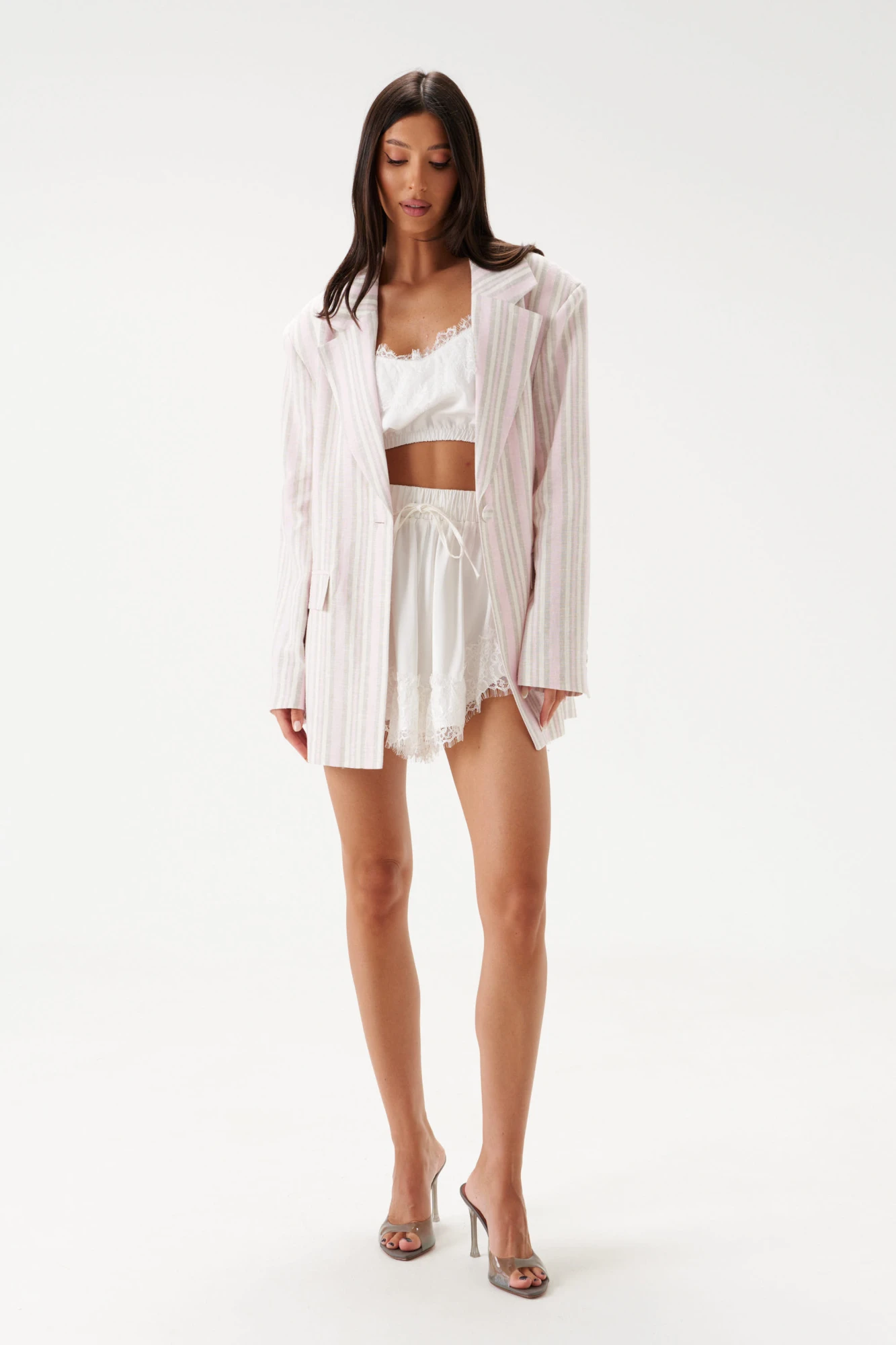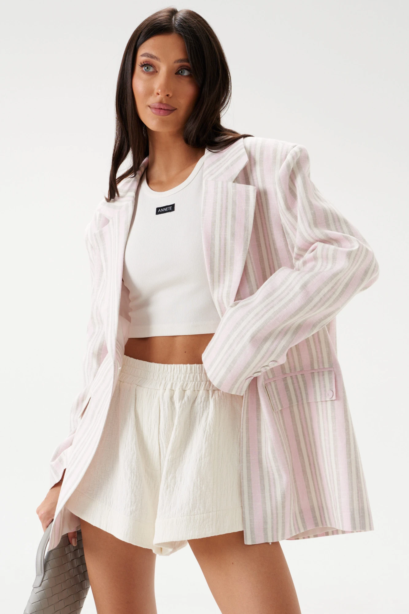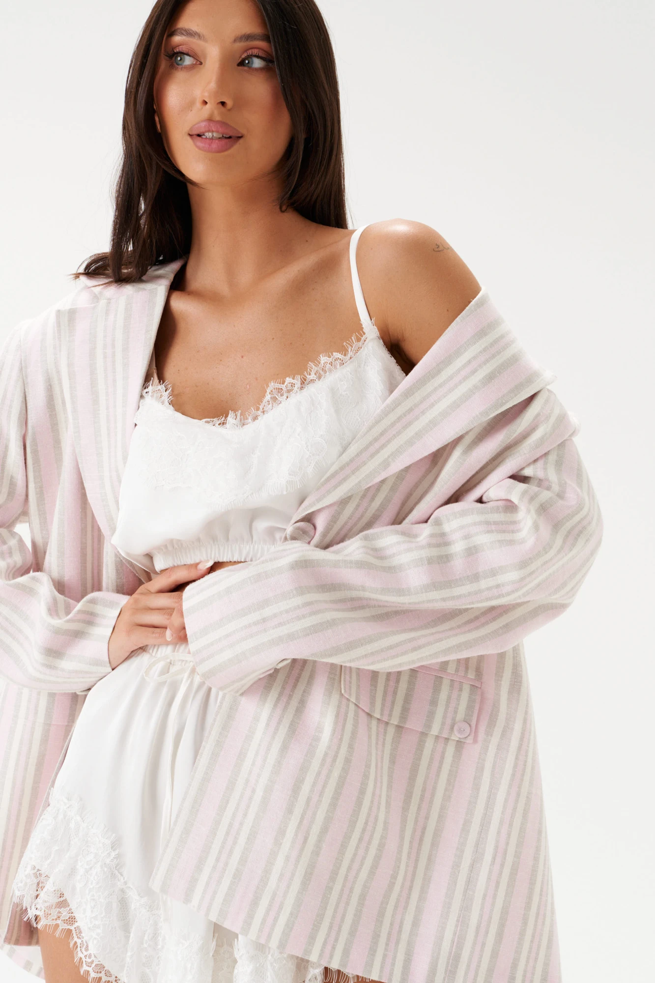 Жакет прямого свободного кроя выполнен из льняного (смесового) полотна бежевого цвета в розово-песочную полоску. Характеристики: прямой свободный крой, подкладка, подплечники, воротник с остроугольным лацканом, застежка центральная на петлю - пуговицу, по переду функциональные карманы с клапаном, рукав втачной, по низу рукава нашиты пуговички, спинка со средним швом, в среднем шве шлица 48 см. Длина по спинке 77, длина рукава 62 см.