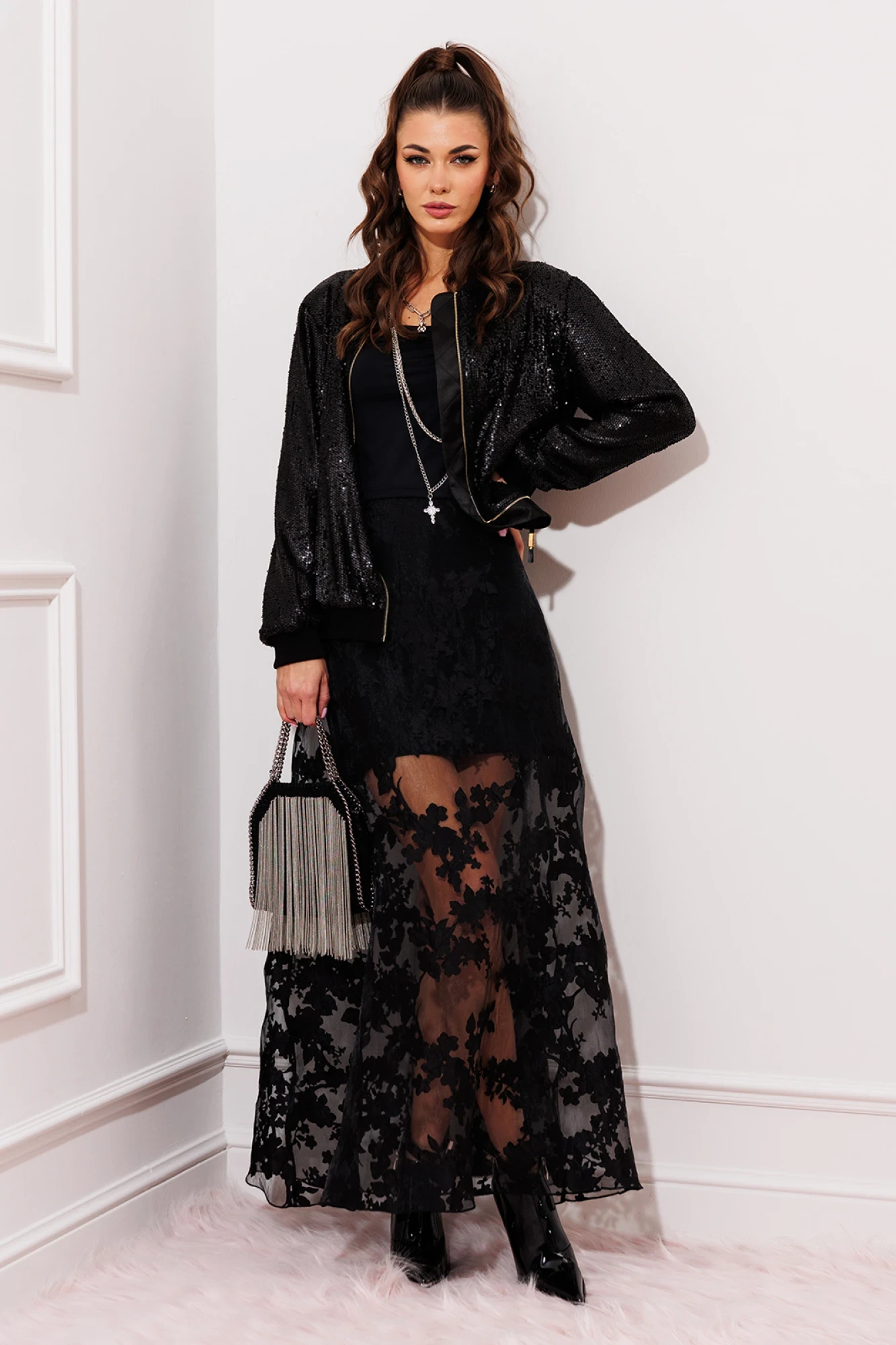 Жакет из трикотажного полотна с пайетками. Прямого силуэта, внизу на манжете из довяза. С центральной застежкой на разьемную декоративную молнию с отделочным слайдером, под молнию пришита декоративная атласная планка. Горловина округлая с довязом. Рукав втачной одношовный, внизу с довязом. Жакет на атласной подкладке в тон.
