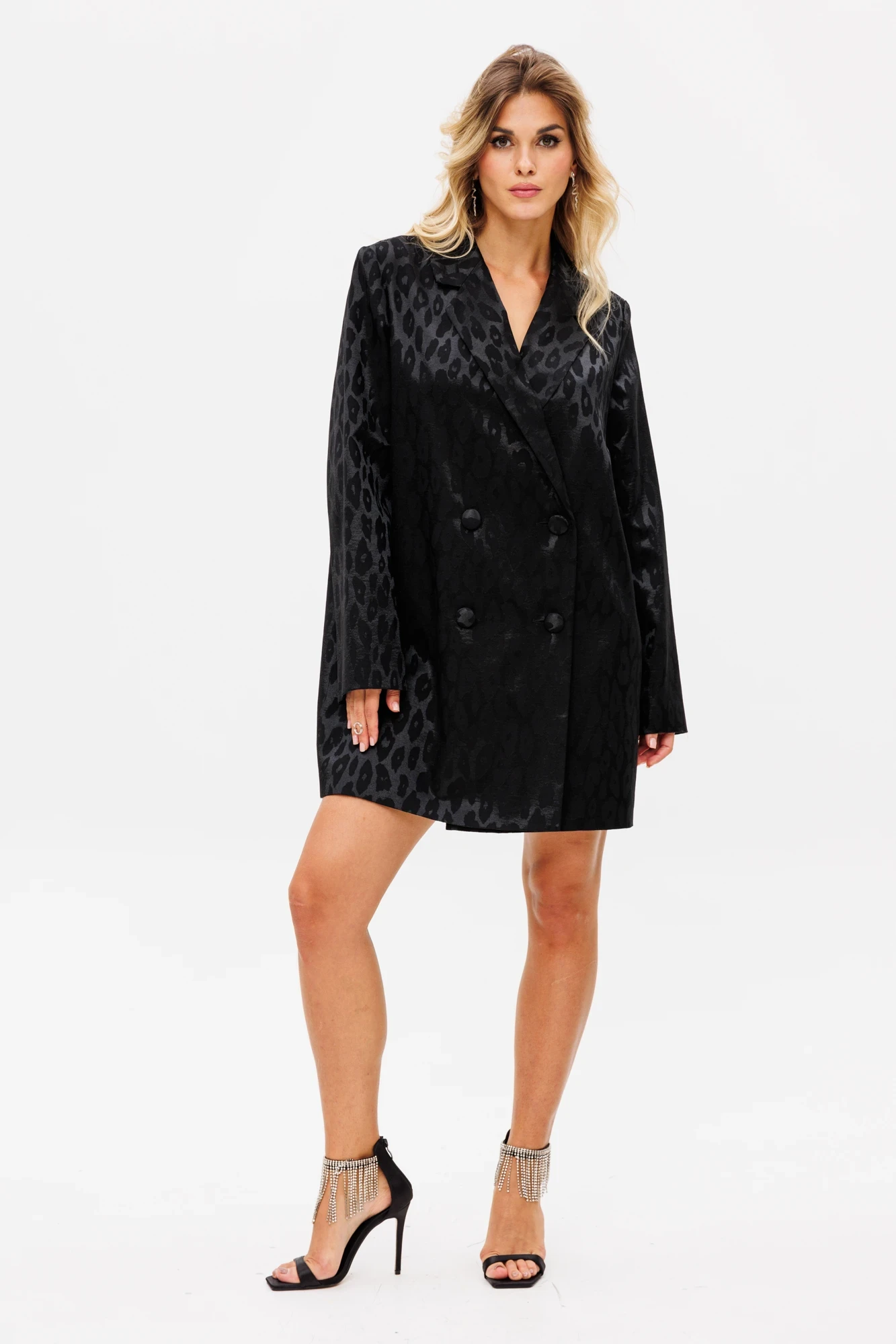 Жакет выполнен из костюмно-плательной ткани с анималистичным принтом. Жакет прямого силуэта , длиной ниже линии бедер. Спереди лацканы и двубортная застежкана пуговицы. Спинка цельная. Горловина пиджачного типа. Рукав втачной, двухшовный. Жакет на притачной по низу подкладке.