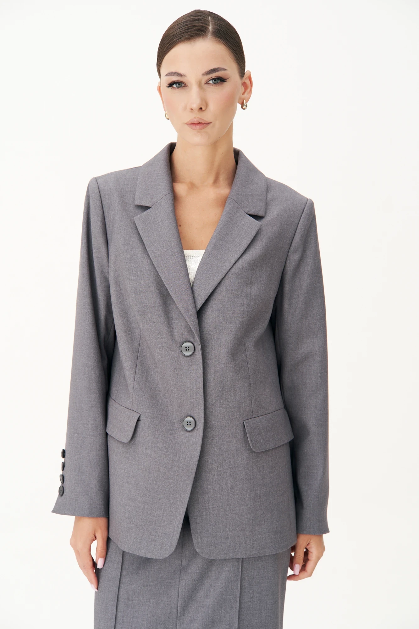 "Жакет классического полуприлегающего силуэта, втачного покроя с центральной застёжкой и английским воротником. Полочка с отрезным бочком, талиевой вытачкой и прорезным карманом с клапаном. Спинка с центральным швом, отрезным бочком и плечевой вытачкой. Рукав двухшовный с отлетной шлицей и отделочными пуговицами.