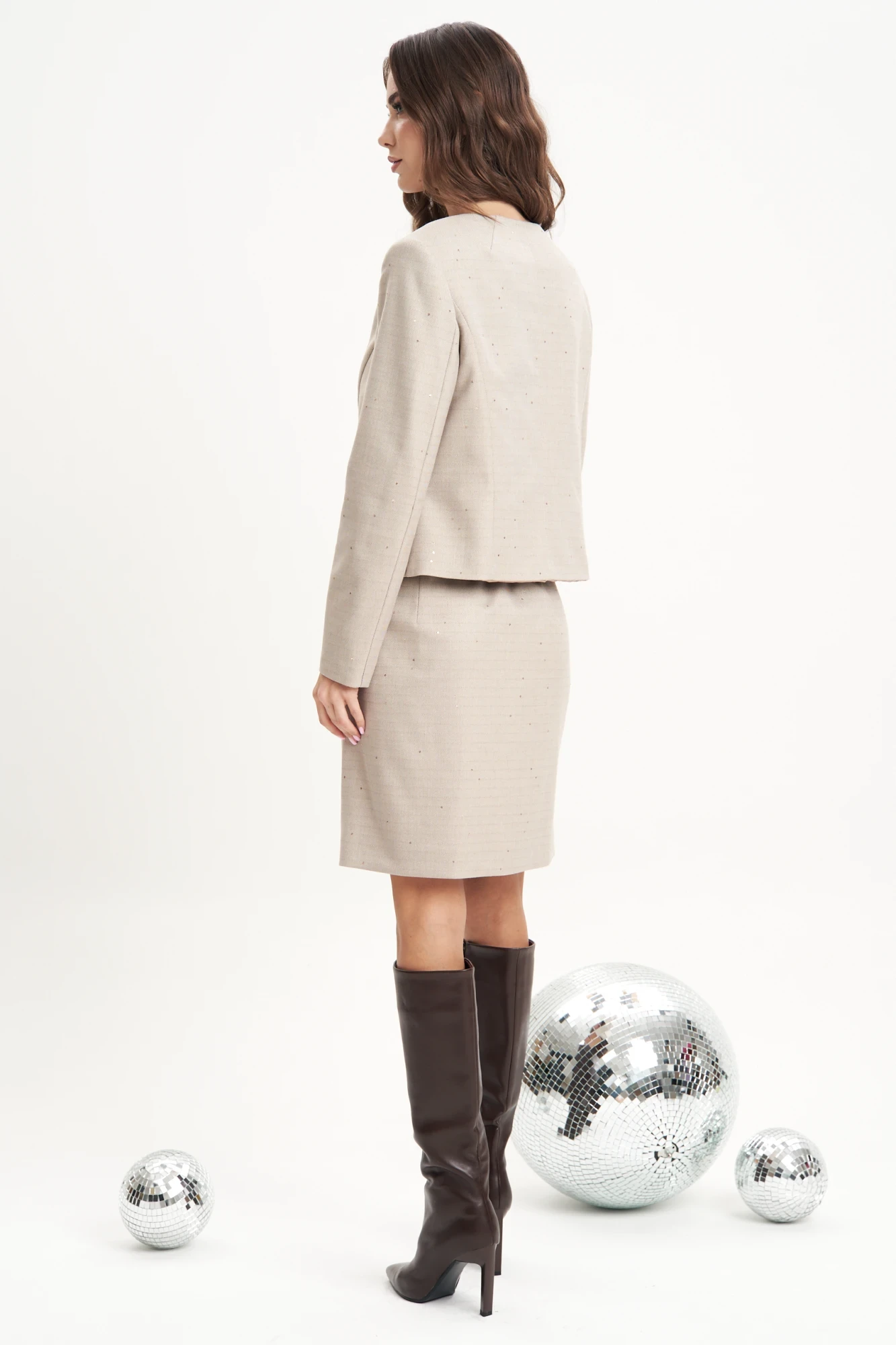 Жакет из необычного по текстуре материала с вкраплением пайетки, брюки из полотна без пайетки. Полуприлегающий силуэт пиджака с центральной застёжкой, круглым вырезом горловины и втачным покроем. Полочка с фигурным рельефом, спинка с фигурным рельефом, центральным швом и плечевыми вытачками. Рукав двухшовный.