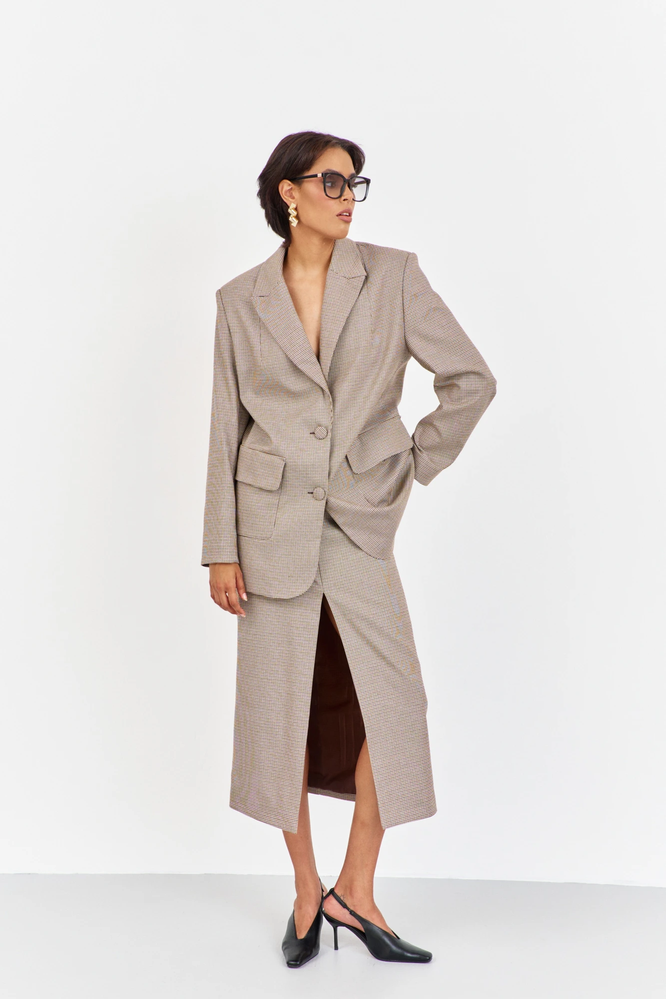Жакет свободного кроя. Характеристики: выполнен из костюмной ткани в принте"гусиная лапка" капучино, однобортная застежка на петли и пуговицы, жакет на подкладке, накладные карманы с клапанами, по спинке разрез-шлица, рукава двухшовные.