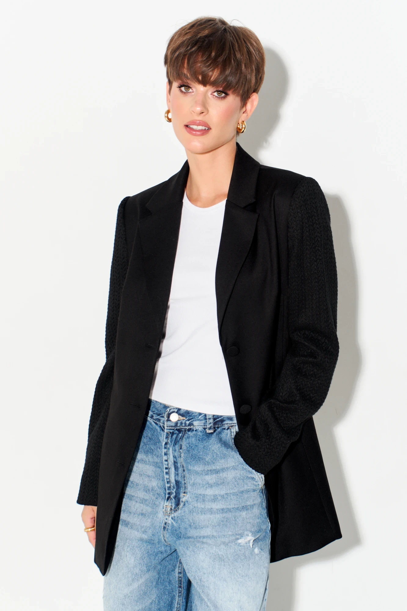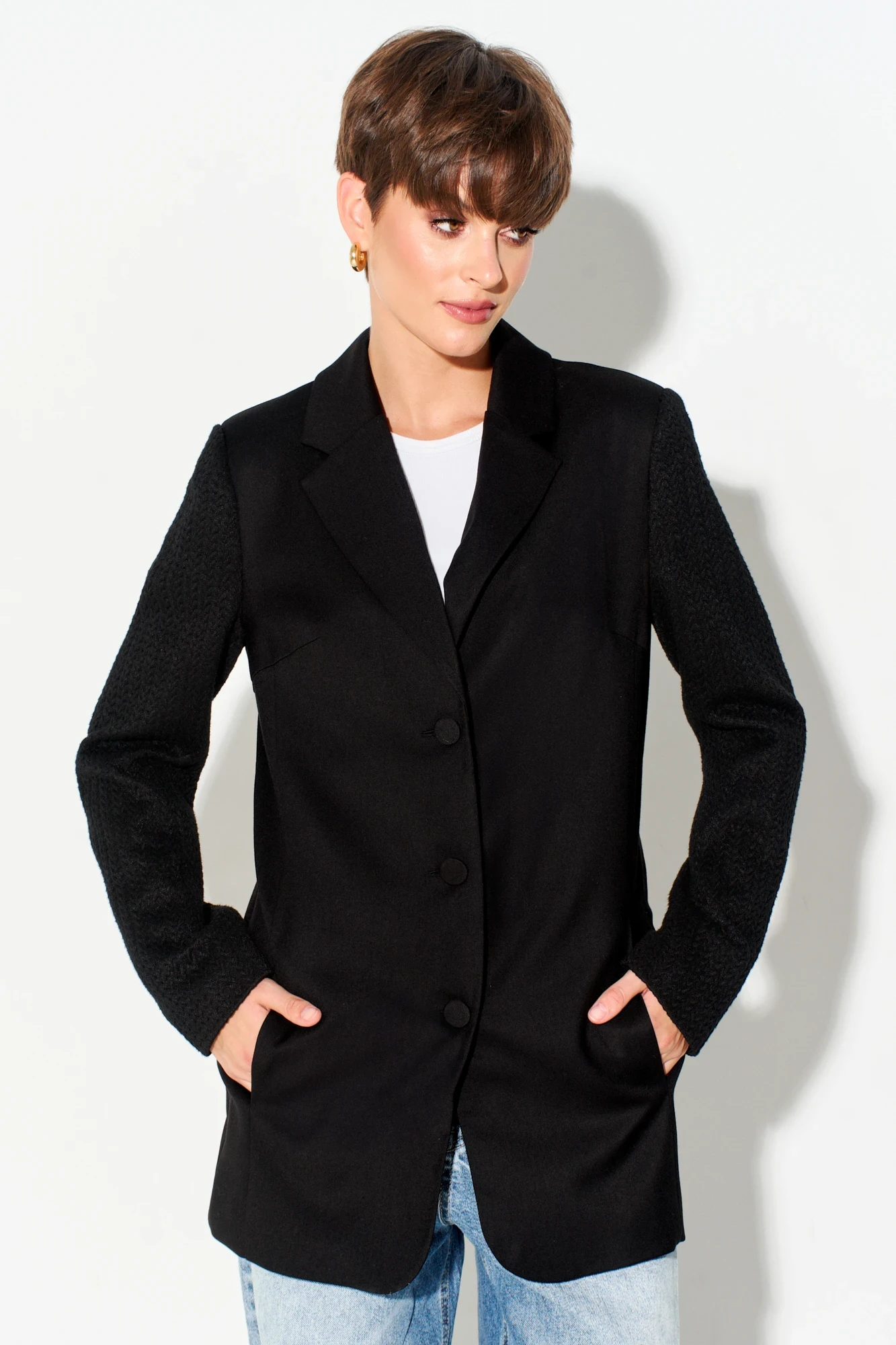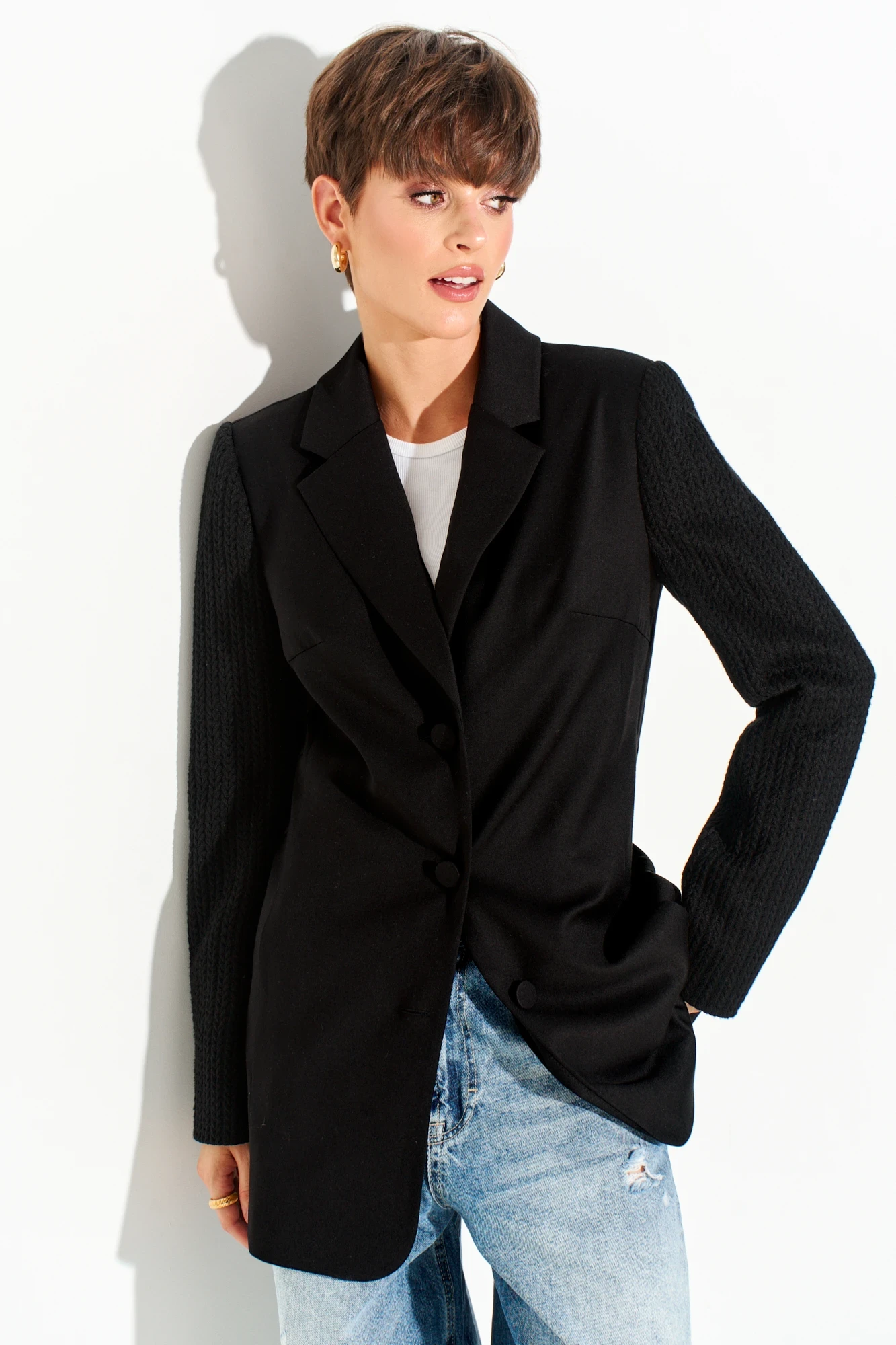 Перед и спинка: костюмная ткань вискоза 70%, полиэстер 25%, спандекс 5%. Рукава: трикотаж в косичку вискоза 55%, полиэстер 40%, спандекс 5%.