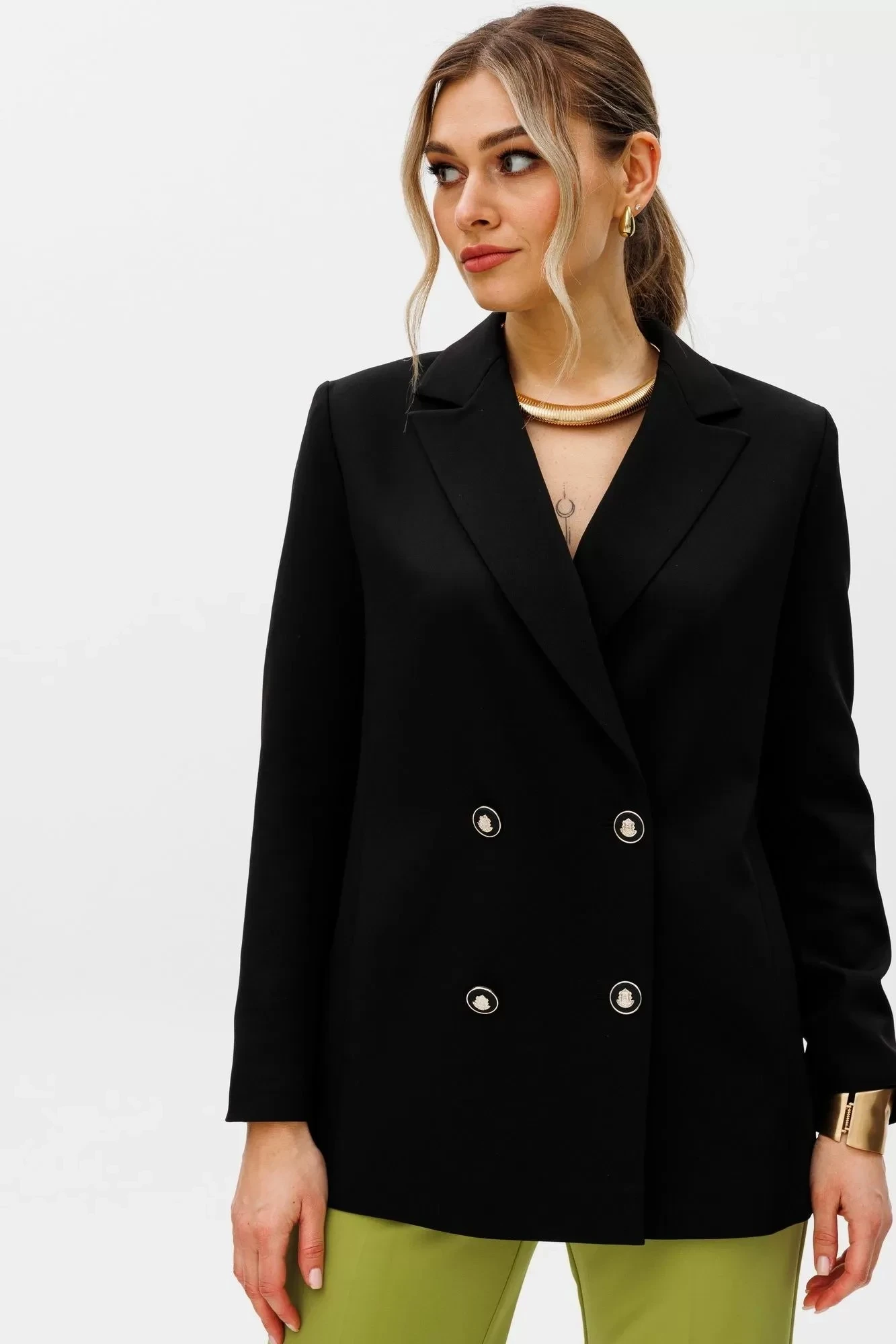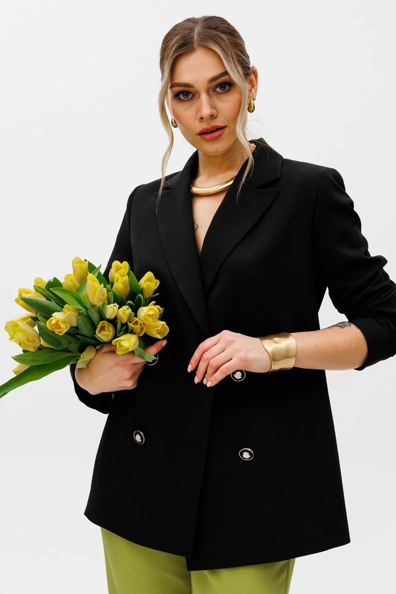 Жакет свободного силуэта, с двубортной с застежкой на четыре пуговицы. Полочки с отрезными бочками, с нагрудной вытачкой из горловины закрытой лацканом. Спинка со средним швом и двумя отрезными бочками. Рукав двухшовный втачной. Жакет на подкладке. Длина жакета 72 см, рукава - 60 см