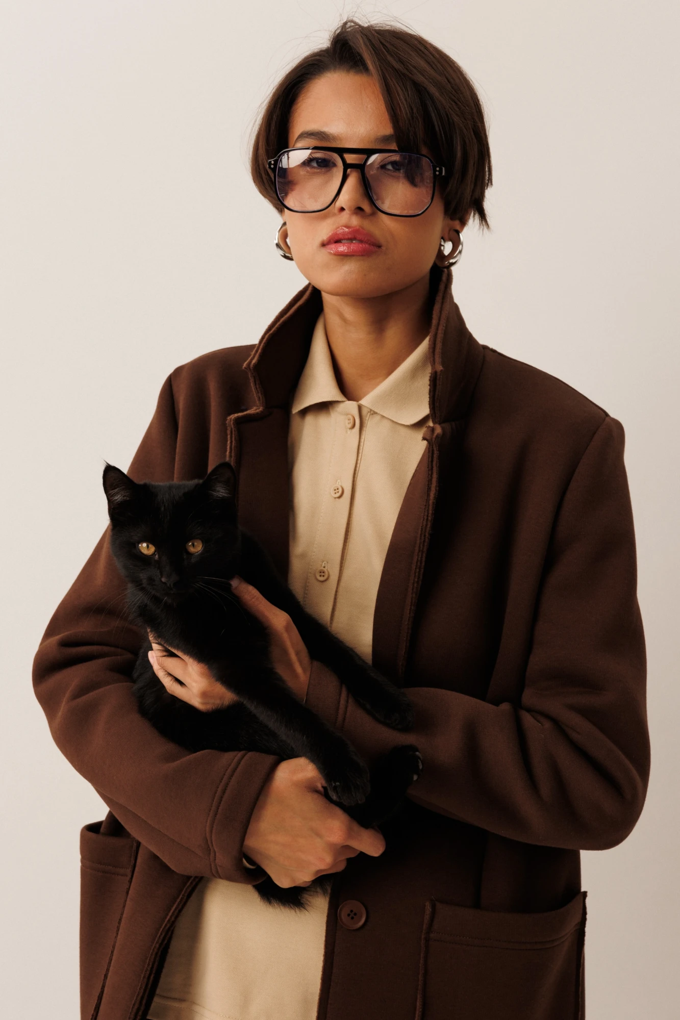 Жакет в стиле smart casual. Жакет прямого силуэта с пиджачным воротником, имеет удобные накладные карманы и застежку на 2 пуговицы. На левом лацкане вышивка-логотип в цвет ткани. Низ и борта имеют открытые края (эффект необработанного шва), укреплены дополнительной строчкой. Жакет без подкладки.