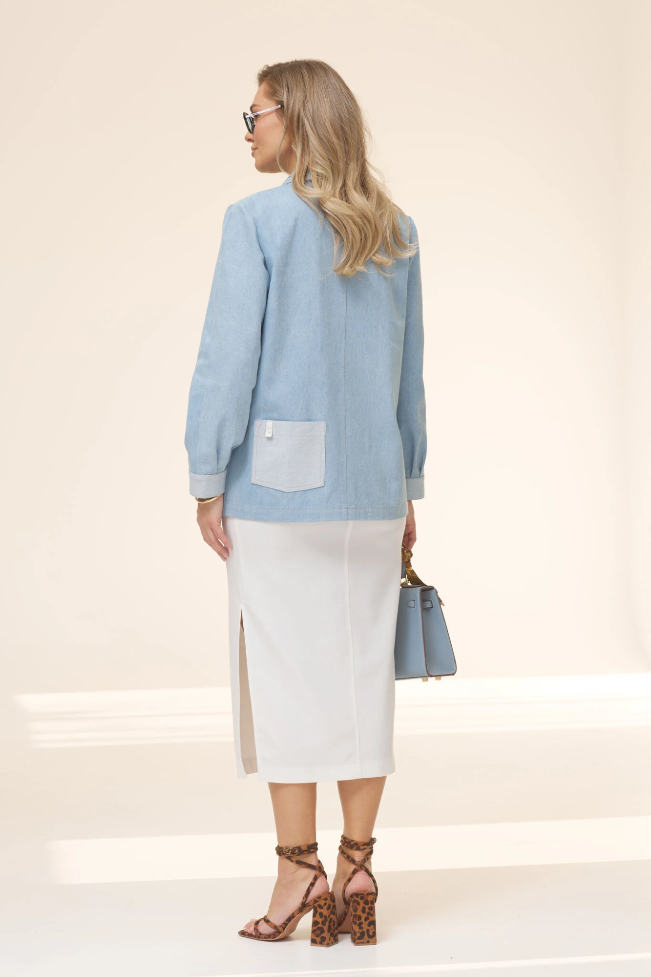 Жакет женский, прямого силуэта с центральной бортовой застежкой на петли и пуговицы. По переду обработаны вытачки, рельефы, прорезные карманы с клапаном и листочкой. Справа, в области груди, расположены 2 накладных кармана, декорированных нашивкой. Спинка со средним швом и накладным карманом слева, на котором расположена нашивка. Плечо спущено. Рукав втачной двухшовный, длинный. По низу обработан притачной манжетой, застегивающейся на петлю и пуговицу. Горловина обработана воротником пиджачного типа с отрезной стойкой. . Декоративные элементы и фурнитура могут отличаться от заявленных на фото. Цвет материала может отличаться по тону в зависимости от настроек вашего монитора!