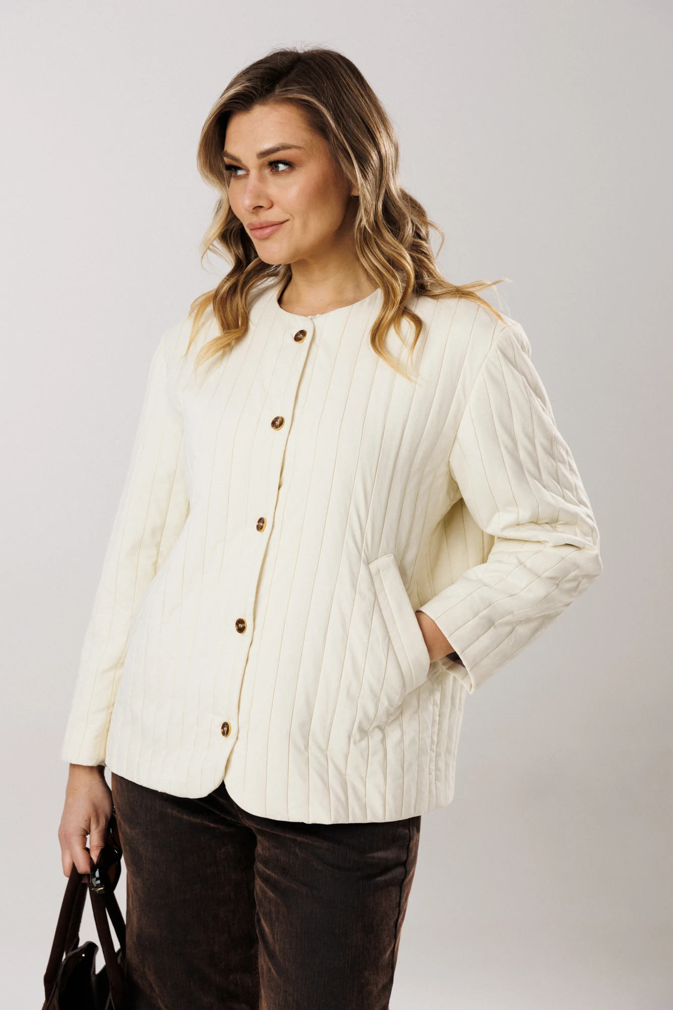 Жакет на подкладке из актуального стеганого полотна, прямого свободного силуэта с прибавками умеренного направления oversize. Линия плеча чуть спущена. Рукав втачной, двухшовный. Длина рукава 60-62 см.