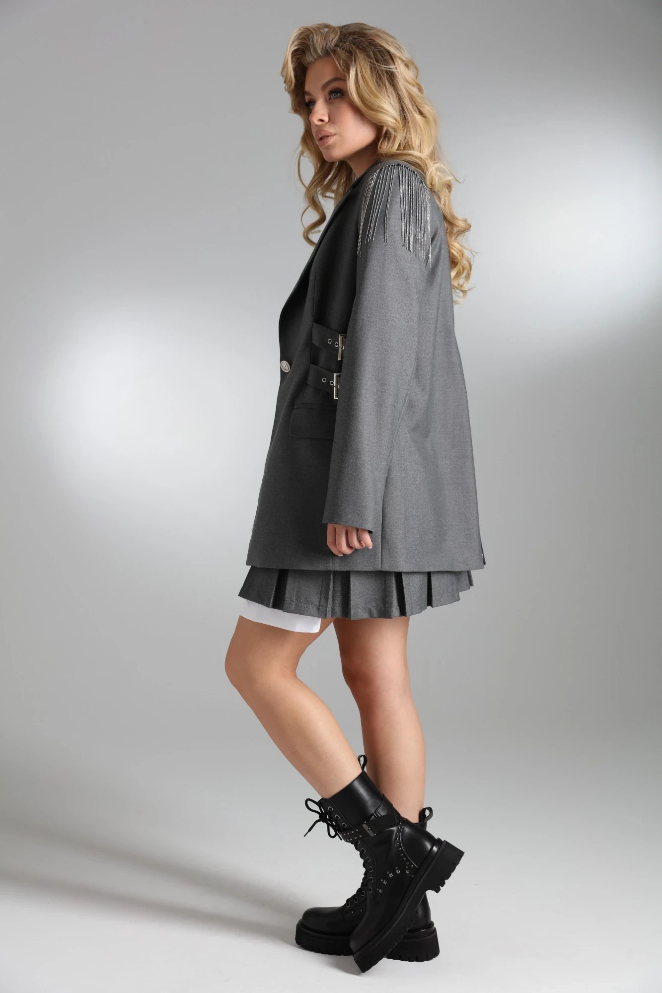 Однобортный объёмный жакет на подкладке прямого силуэта из костюмной полушерстяной ткани высокого качества. По переду изделия прорезные карманы с клапанами. Рукава втачные двухшовные. Спинка со средним швом и завышенной шлицей. В качестве декора по верхней части оката рукавов пришиты цепочки, а по бокам выполнена имитация ремней из основной ткани с люверсами и пряжкой.