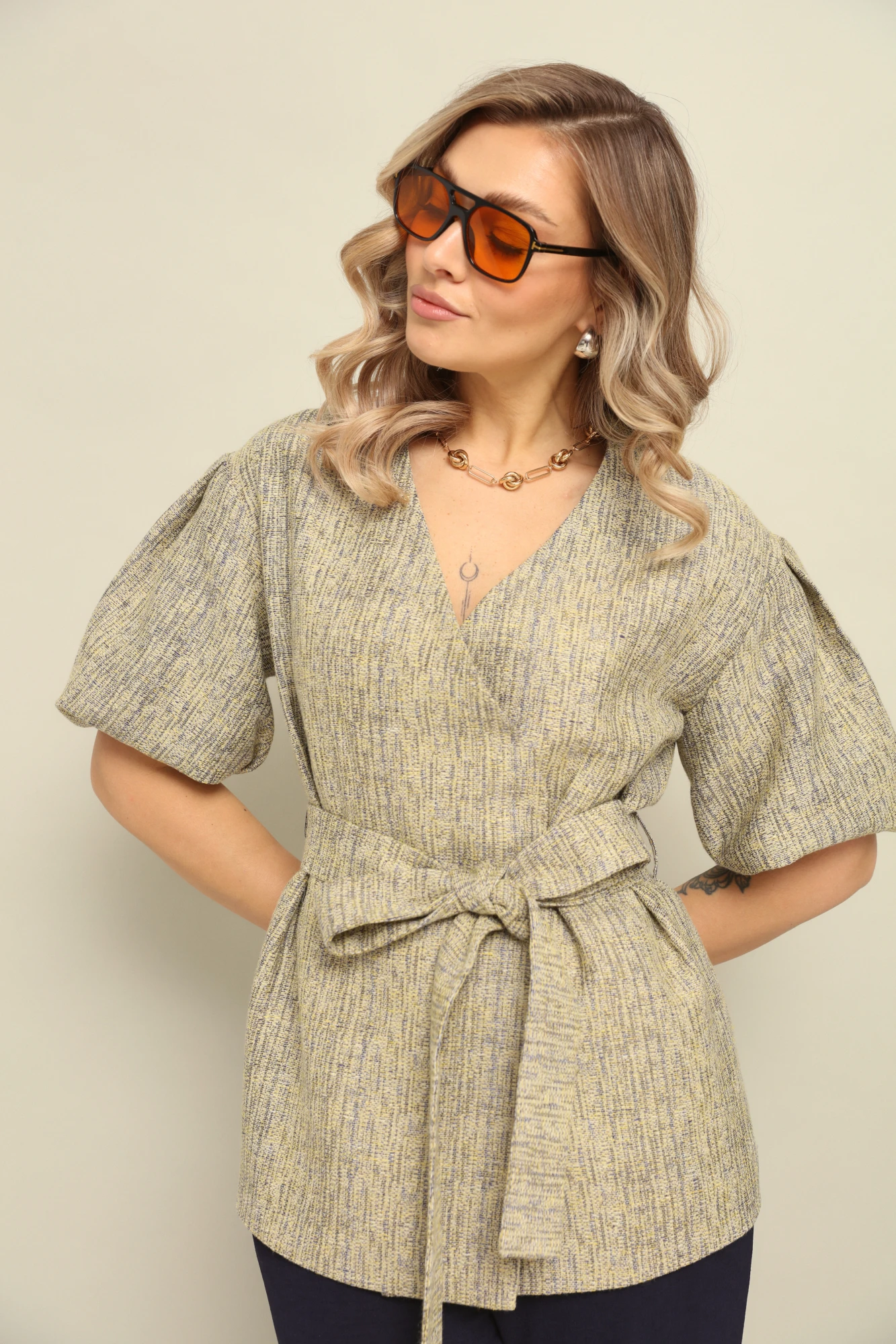 Легкий жакет на подкладке с объёмными рукавами. Перед на запах без застежки, под пояс по талии.