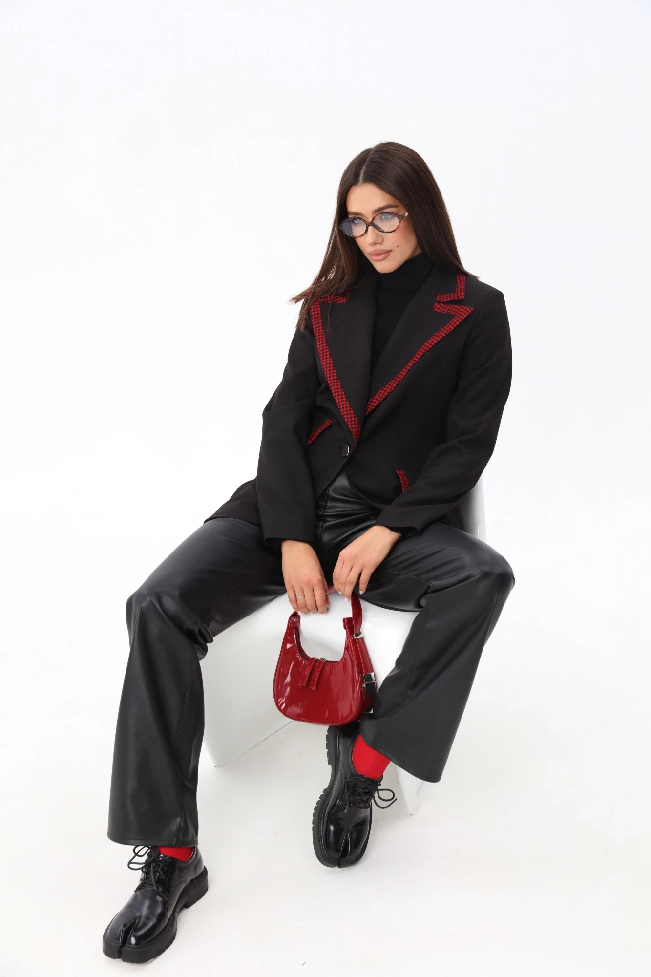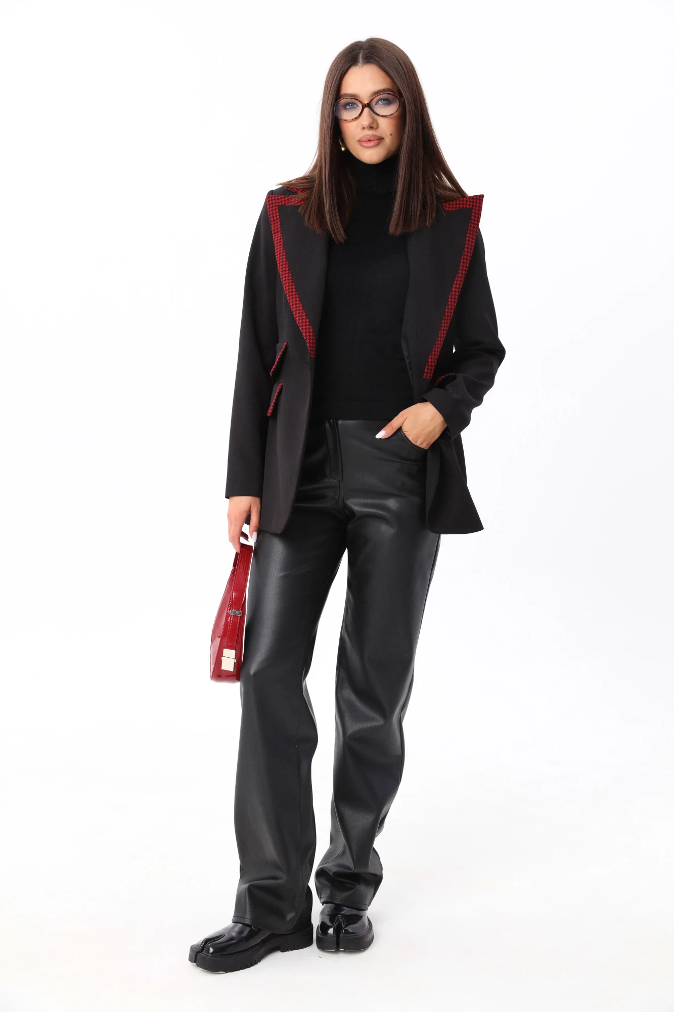 Жакет однобортный умеренного объёма приталенного силуэта с застёжкой на пуговицу. По бокам расположены функциональные прорезные карманы с клапаном. Окантовка воротника и клапанов карманов выполнена из яркой контрастной ткани с принтом "гусиная лапка". Рост фотомодели 175 см. Размер у фотомодели – 44.