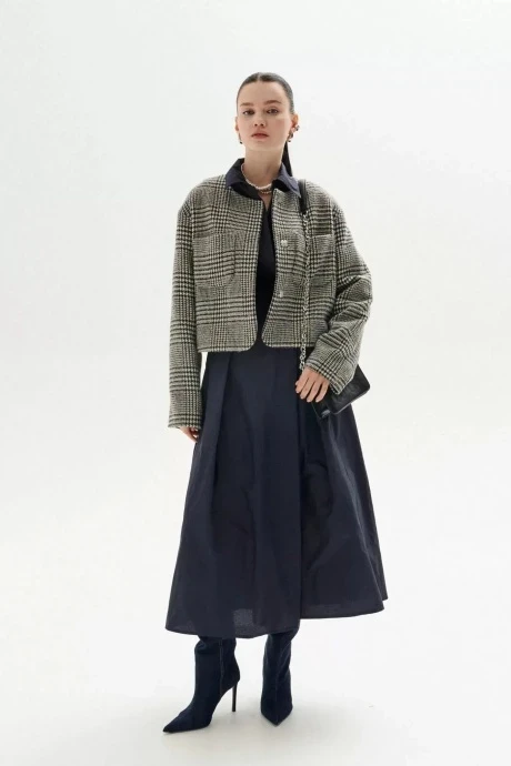 Жакет свободного кроя прямого силуэта на подкладке. Округлый вырез горловины. Застёжка на потайные кнопки. По переду накладные карманы на уровне груди. Рукав спущенный, прямой