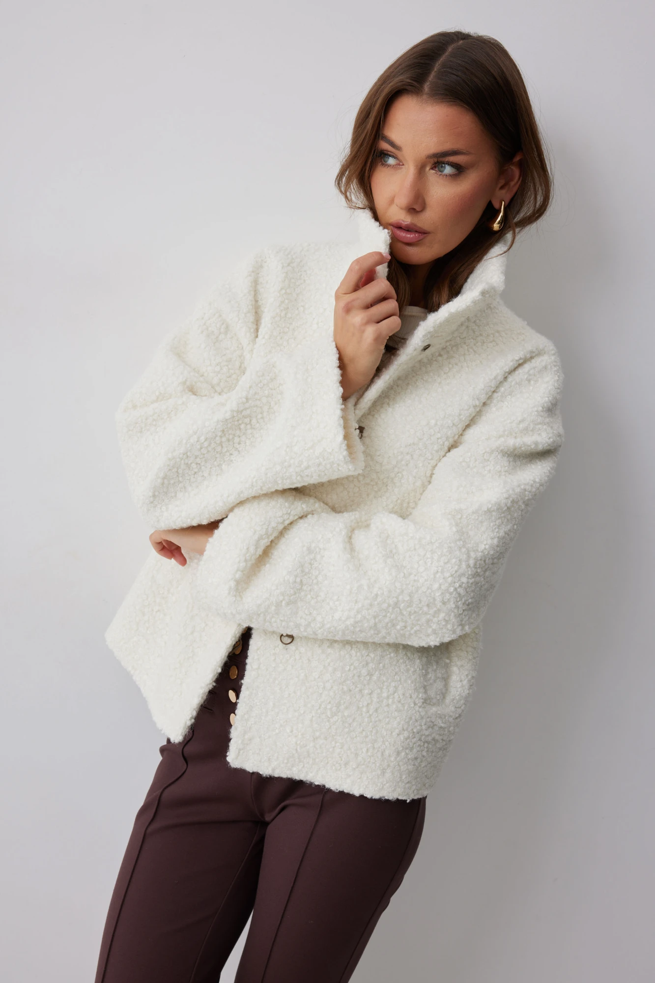 Жакет прямого силуэта из букле на трикотажной основе. Воротник-стойка. Центральная застежка на крючки. Рукав со спущенной линией плеча. По переду прорезные карманы. Жакет на подкладке. Обращаем ваше внимание, что фурнитура может отличаться от фото.
