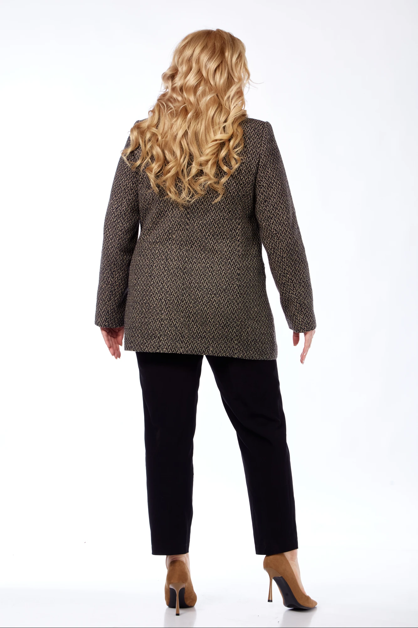 жакет на подкладке прямого силуэта с центральной бортовой застежкой на три пуговицы, с пиджачным воротником, прорезными карманами с листочкой. Спинка со средним швом и двумя рельефами. Рукава втачные двухшовные.