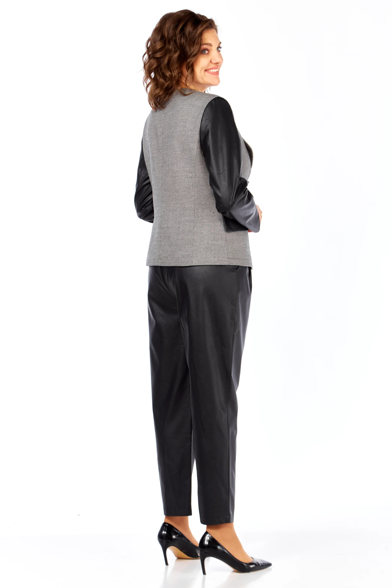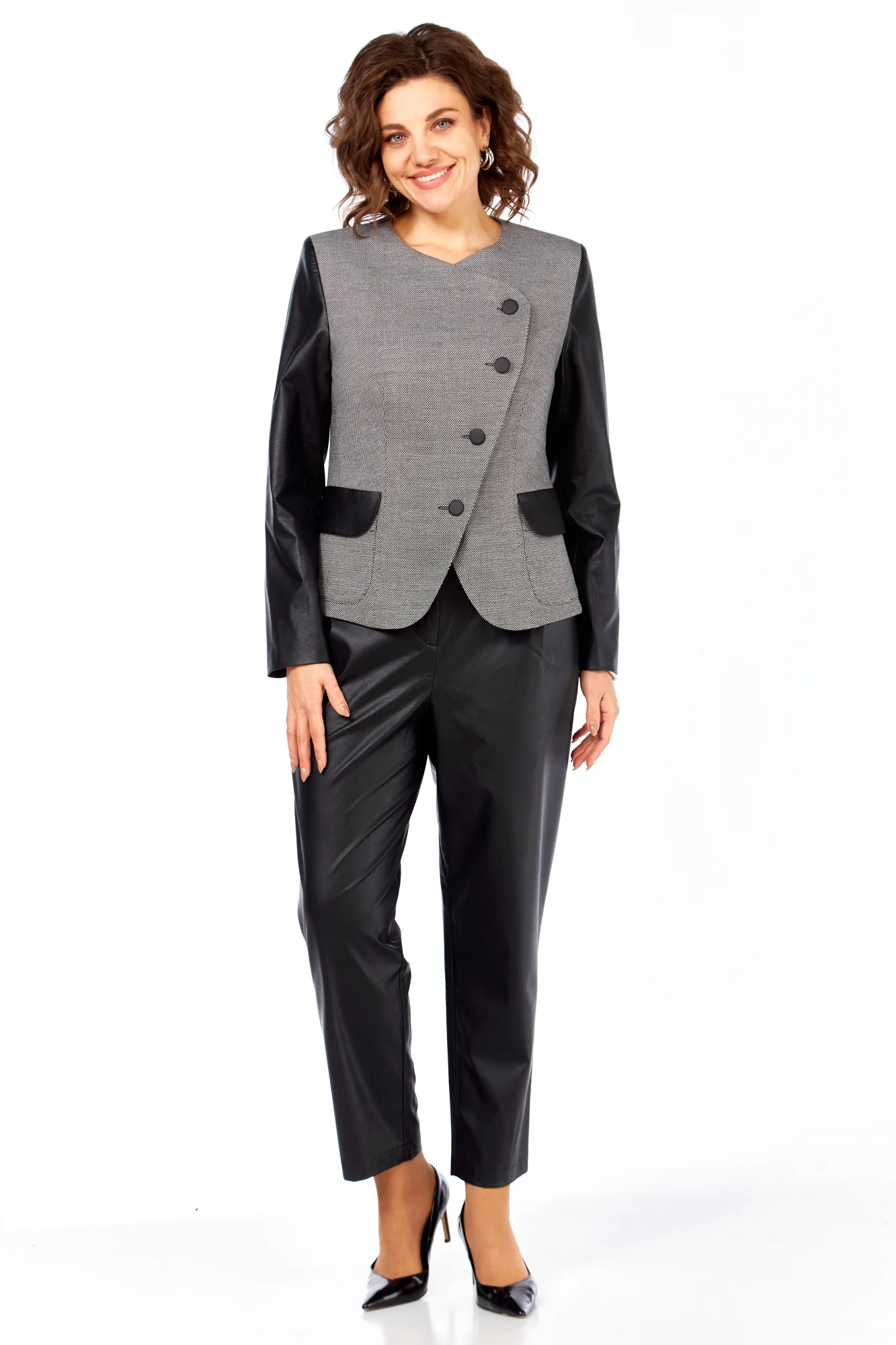 Жакет женский, укороченный, на подкладке. Перед жакета с отрезными бочками, талиевыми вытачками от низа изделия, накладными карманами с клапанами. Линия подборта фигурная с застёжкой на 4 пуговицы. Спинка со средним швом и рельефами. Рукав длинный, втачной, двухшовный.
