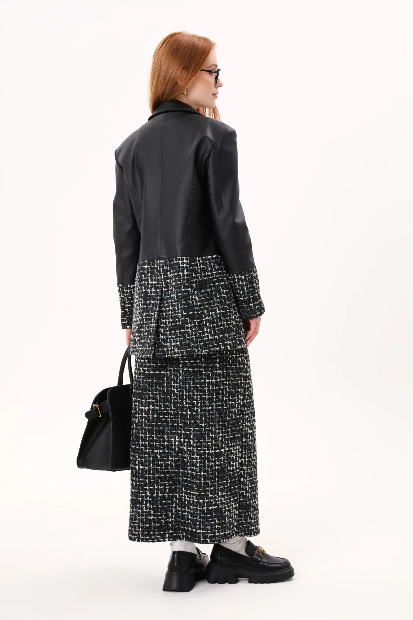 Жакет однобортный из комбинированной ткани: шанель и экокожа. Изделие полуприлегающего силуэта, длиной ниже линии бедер. Рукав втачной, двухшовный. Воротник английский. На переде прорезные карманы в рамку с клапаном. Застежка центральная на петли и пуговицы. В среднем шве спинки шлица.