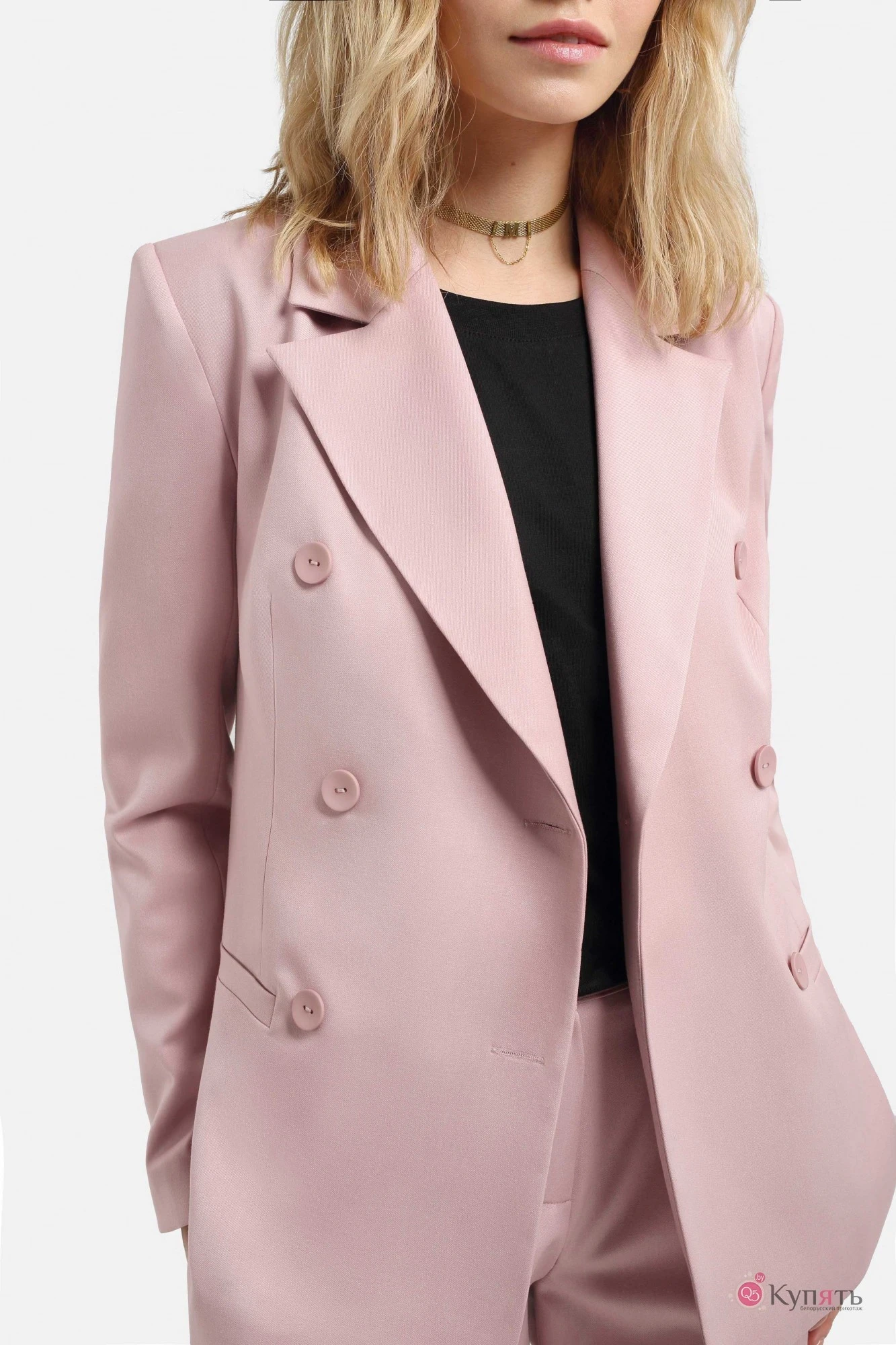 Двубортный жакет прямого силуэта из текстильной ткани. Детали: пиджачный воротник, прорезные карманы, спинка со средним швом, втачные двухшовные рукава, застежка на петли и пуговицы, жакет на подкладке