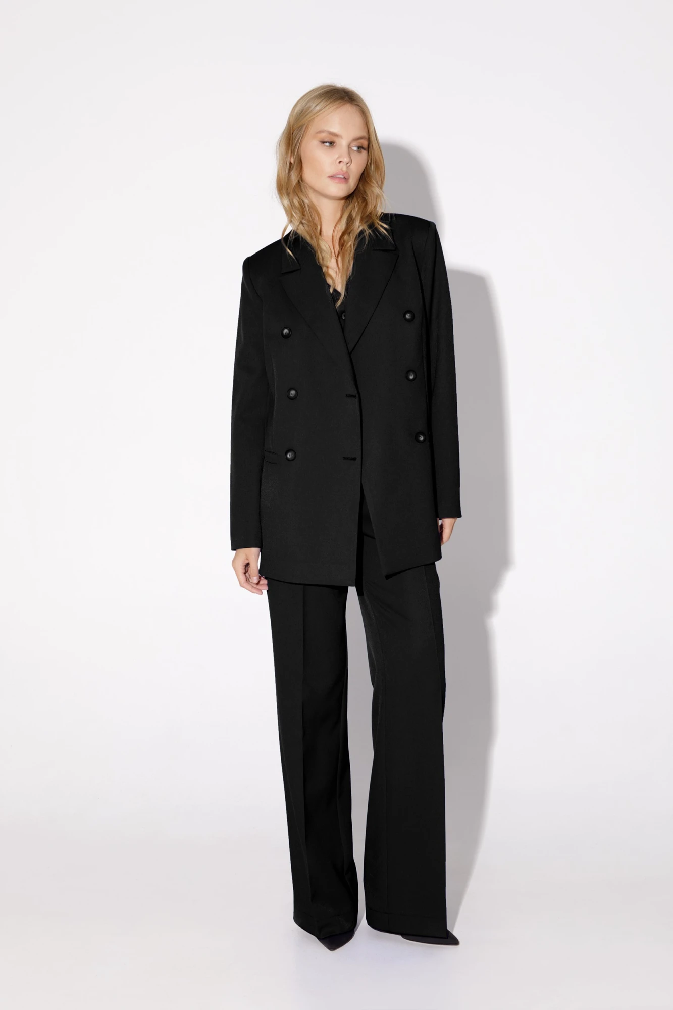 Классический двубортный жакет из текстильной ткани. Детали: жакет полуприлегающего силуэта, пиджачный воротник, перед с прорезными карманами, двубортная застежка на петли и пуговицы, спинка со средним швом, рукава втачные двухшовные, жакет на подкладке. Длина жакета по спинке около 66 см в размерах 40-46 и около 69 см в размерах 48-52, длина рукавов около 61 см.
