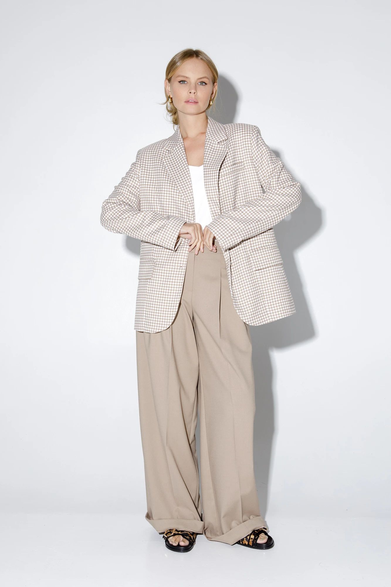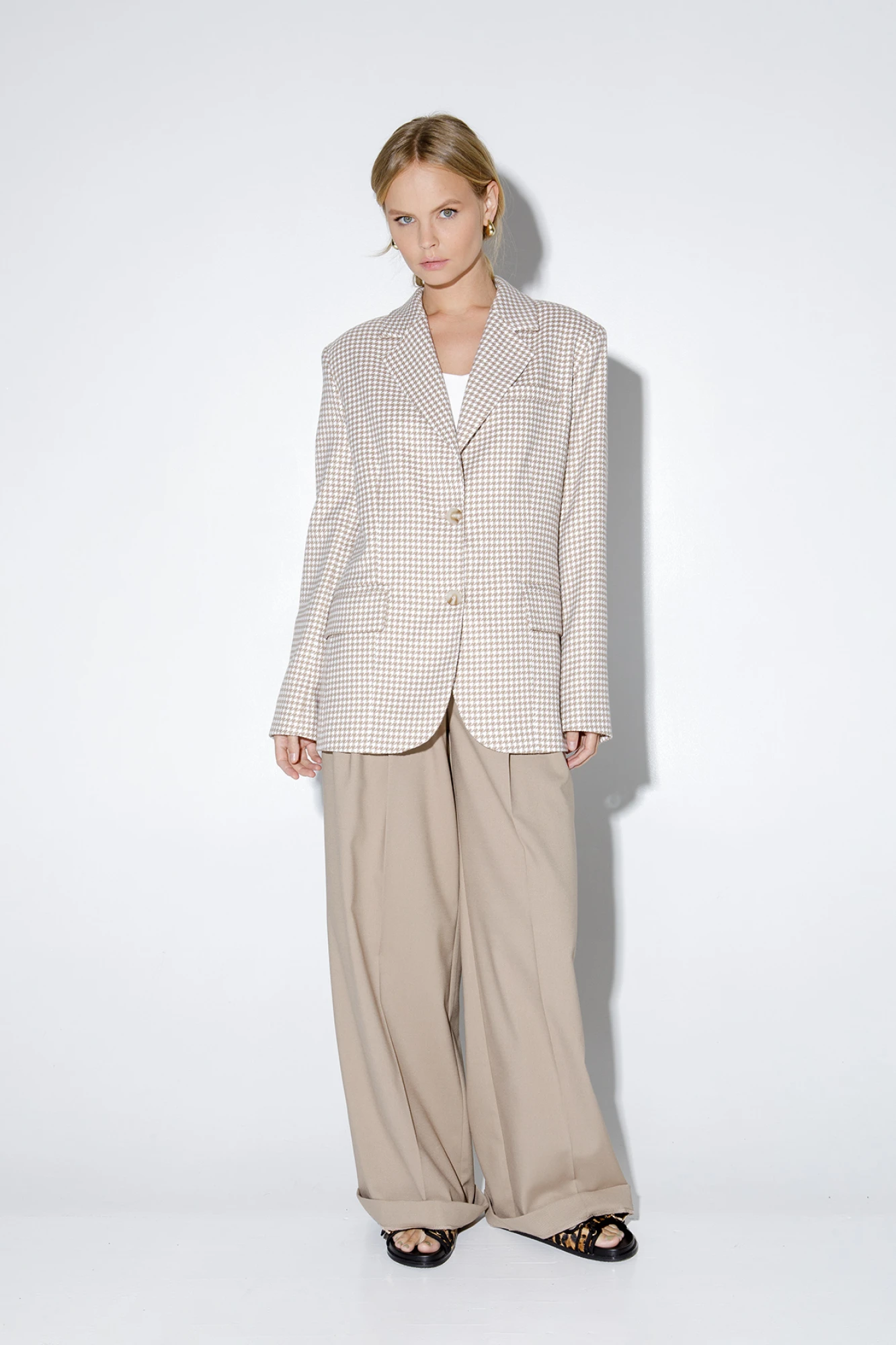 Оверсайз жакет из текстильной ткани с рисунком «гусиная лапка». Детали: жакет прямого силуэта, расширенная линия плеч, пиджачный воротник, перед с прорезными функциональными карманами, однобортная застежка на петли и пуговицы, спинка со средним швом и шлицей, рукава втачные двухшовные, на подкладке. Длина жакета по спинке около 69 см в размерах 40-46 и около 72 см в размерах 48-52, длина рукавов около 62 см.