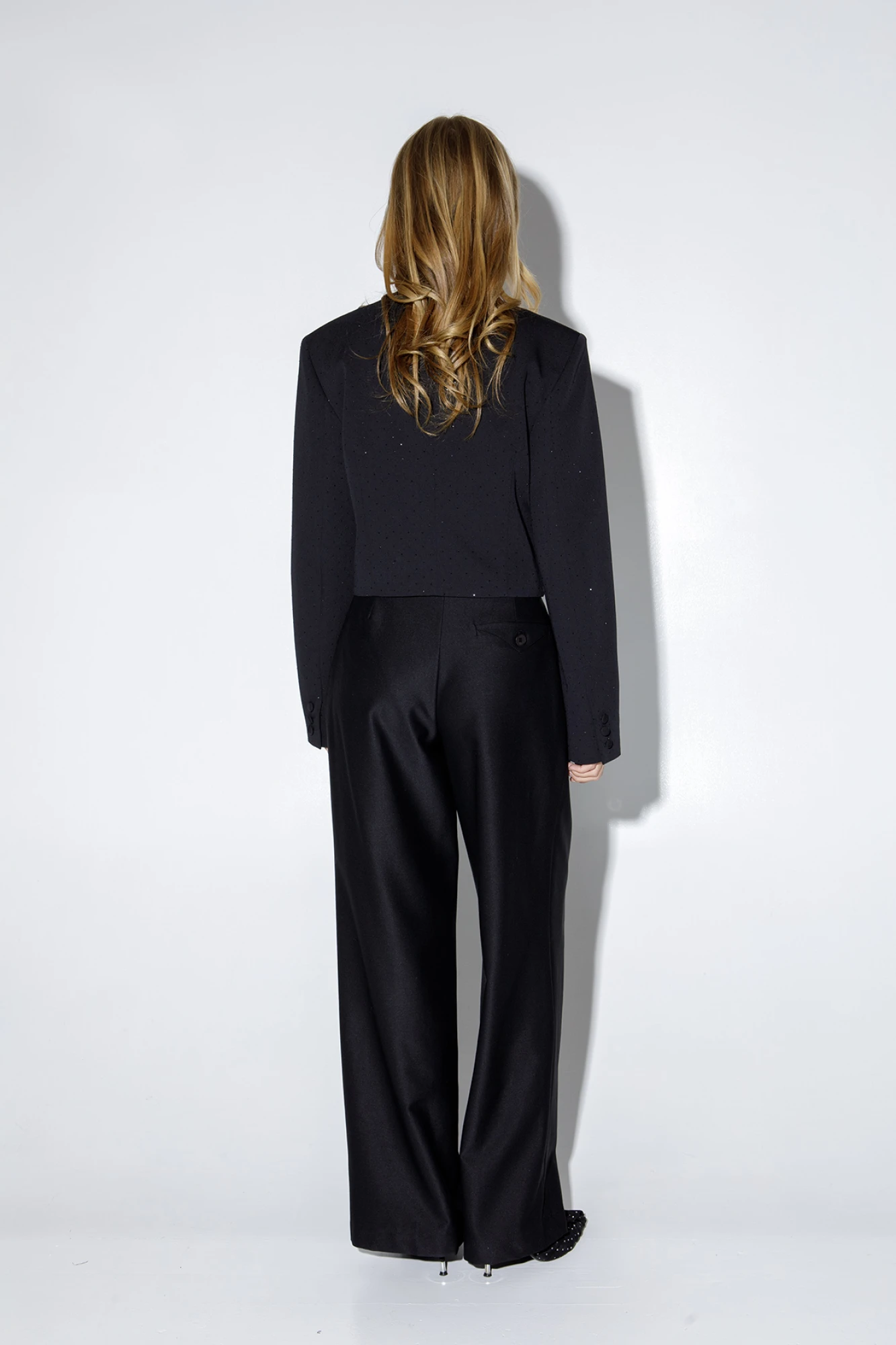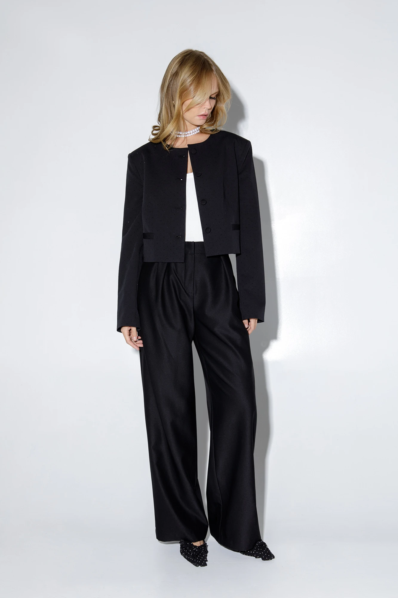 Укороченный жакет из текстильной ткани со стразами. Детали: жакет прямого силуэта, расширенная линия плеч, талиевые вытачки, перед с прорезными функциональными карманами, однобортная застежка на петли и пуговицы, спинка со средним швом, рукава втачные двухшовные, на подкладке. Длина по спинке около 44 см в размерах 40-46 и около 46 см в размерах 48-52, длина рукавов около 62 см.