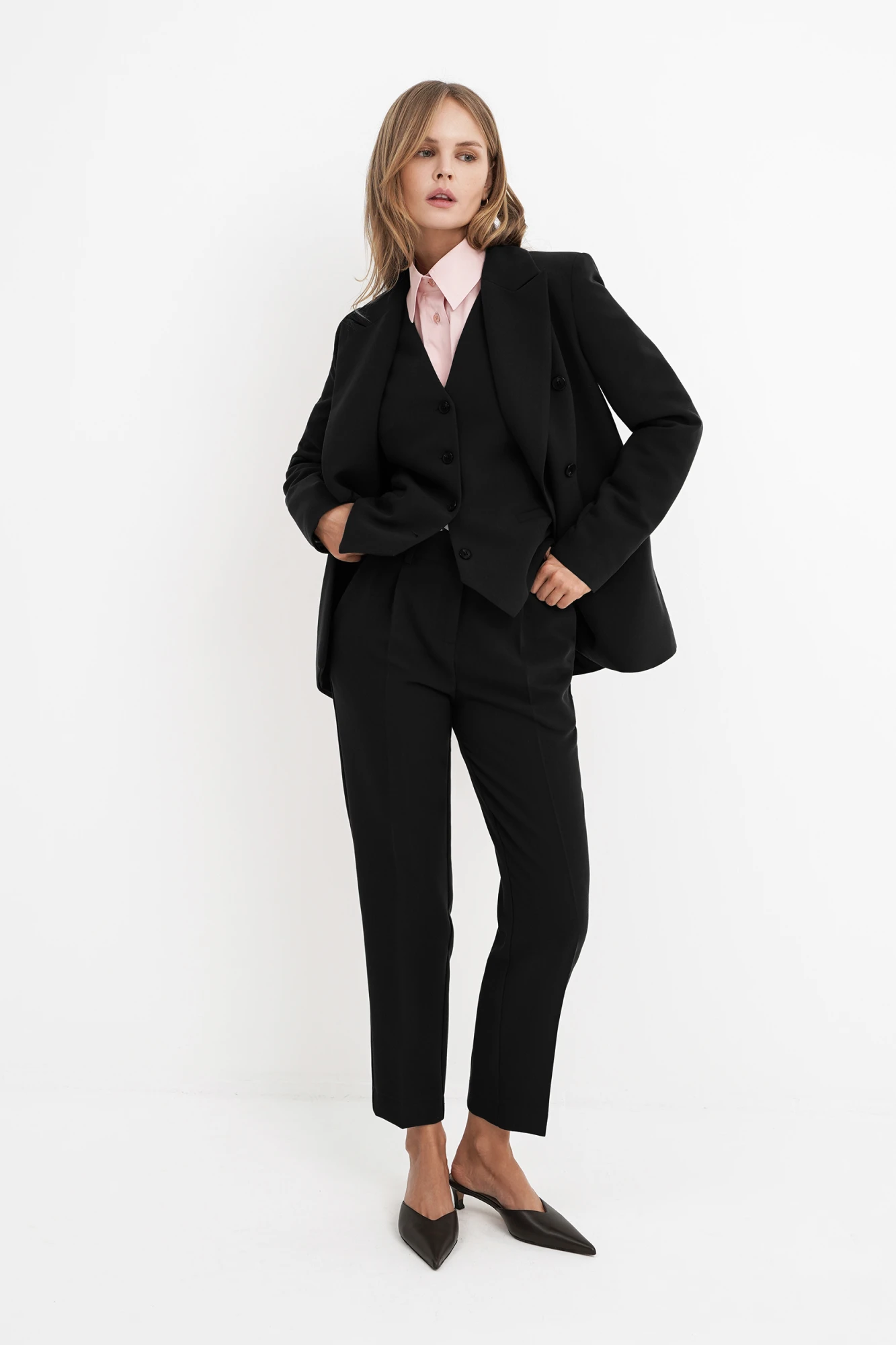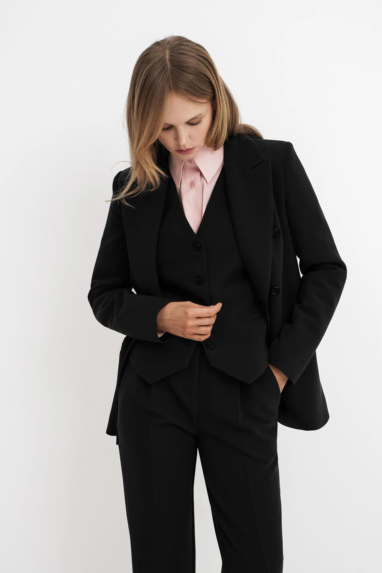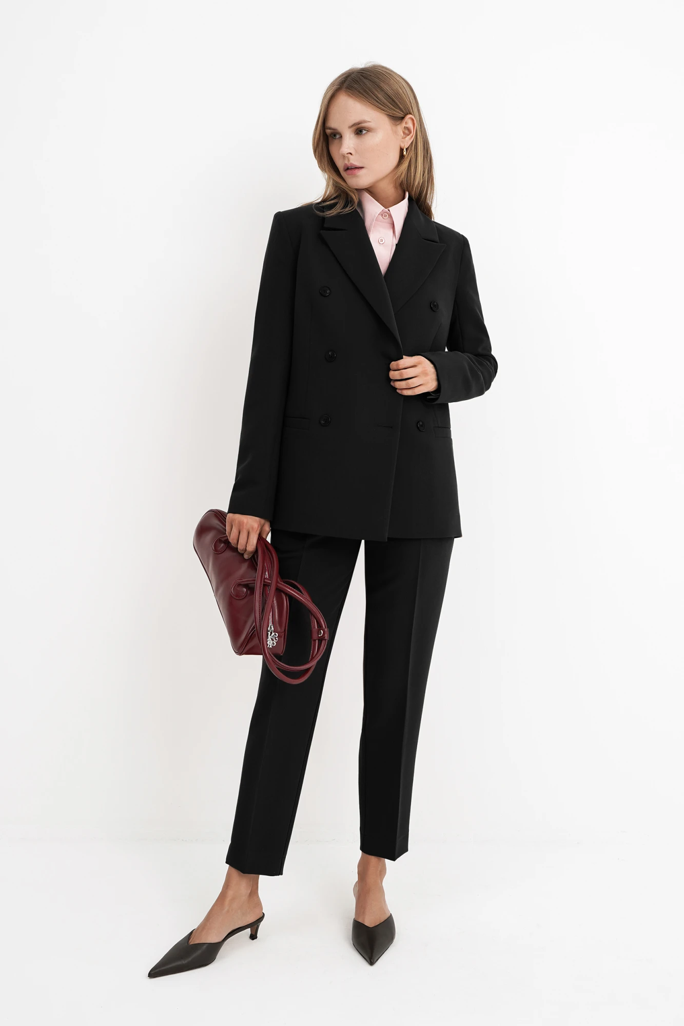Текстильный двубортный жакет с классической посадкой. Детали: жакет прямого силуэта, пиджачный воротник, перед с прорезными карманами, застежка на петли и пуговицы, спинка со средним швом, рукава втачные двухшовные, жакет на подкладке. Длина по спинке около 66 см в размерах 40-46 и около 69 см в размерах 48-52, длина рукава около 61 см.