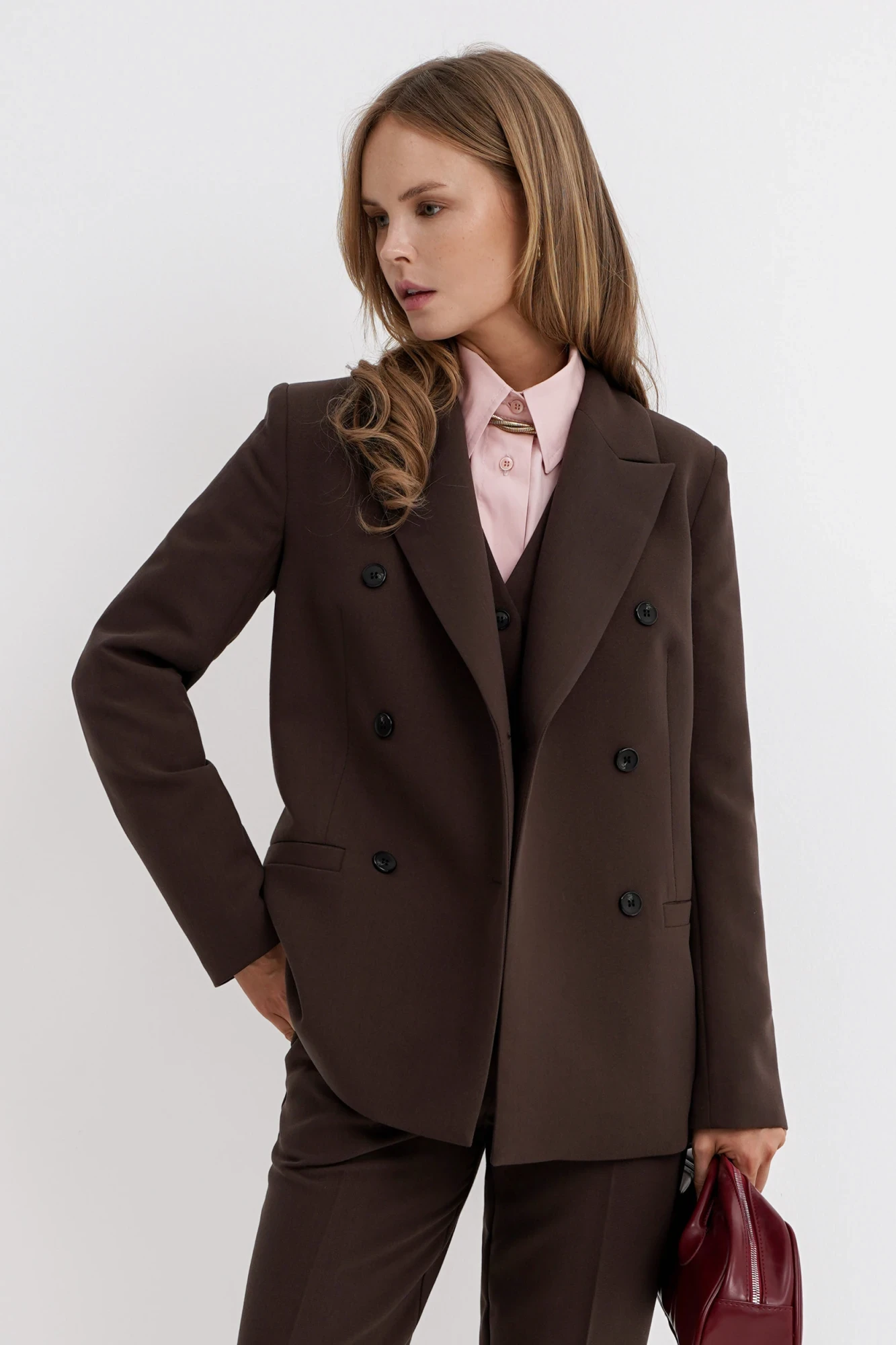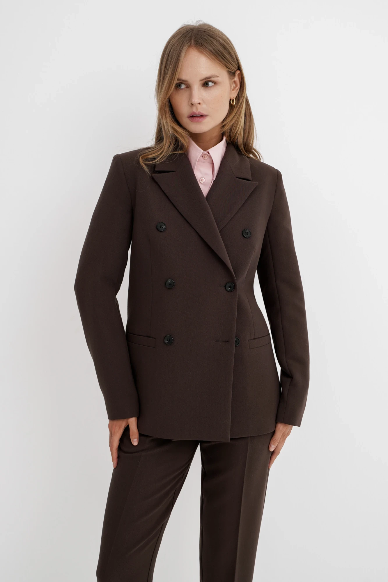 Текстильный двубортный жакет с классической посадкой. Детали: жакет прямого силуэта, пиджачный воротник, перед с прорезными карманами, застежка на петли и пуговицы, спинка со средним швом, рукава втачные двухшовные, жакет на подкладке. Длина по спинке около 66 см в размерах 40-46 и около 69 см в размерах 48-52, длина рукава около 61 см.
