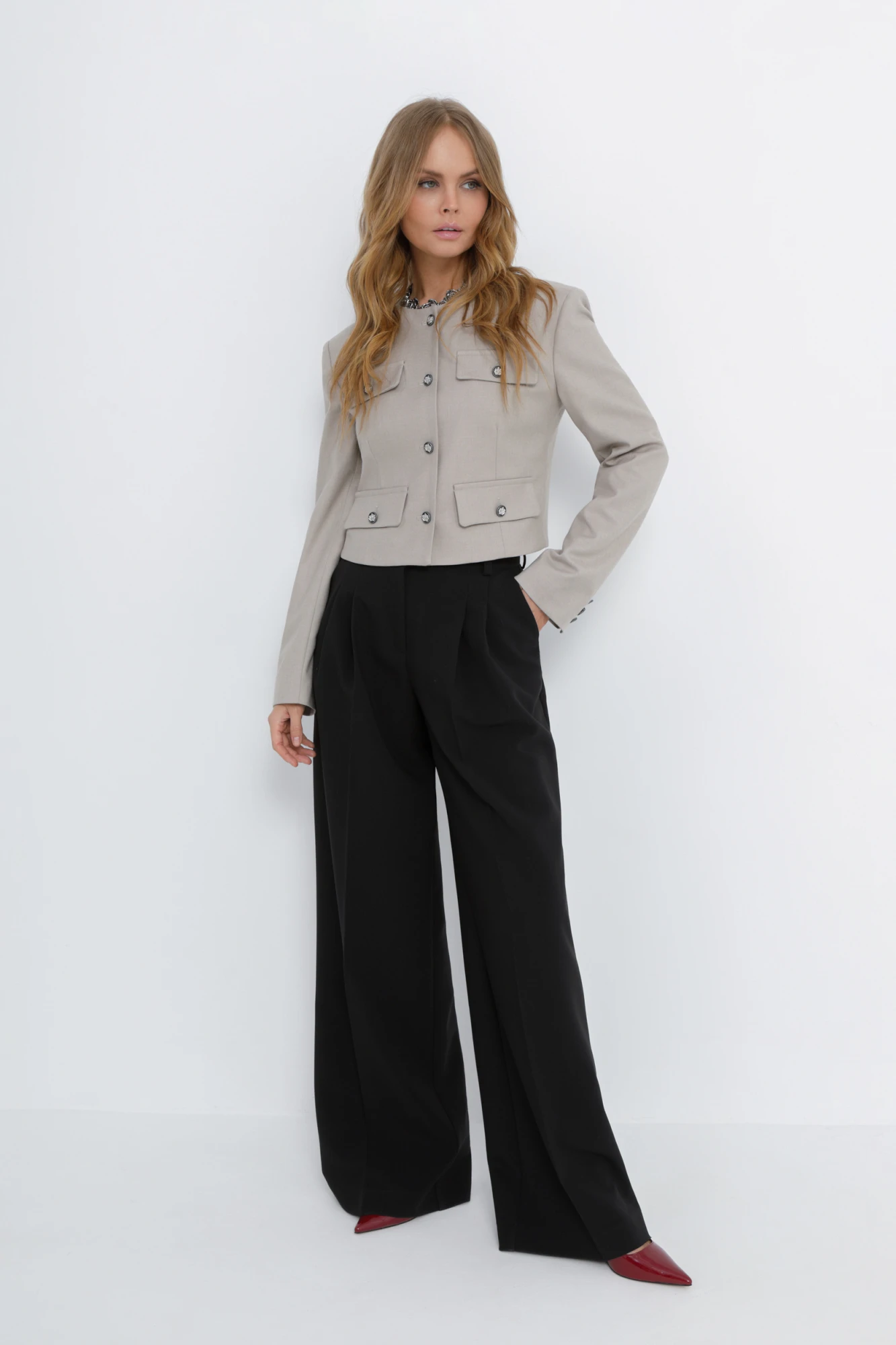 Укороченный жакет из фактурной ткани в стиле «шанель». Детали: прямой силуэт, расширенная линия плеч, талиевые вытачки, круглая горловина, без воротника, рукава втачные со шлицами, имитация карманов, застежка на петли и декоративные пуговицы, на подкладке. Длина по спинке около 42,5 см в размерах 40-46 и около 45,5 см в размерах 48-52, длина рукава около 61 см.