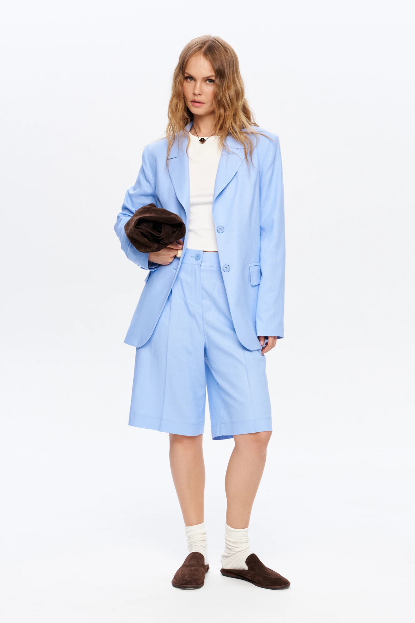 Детали: пиджачный воротник, талиевые вытачки, функциональный нагрудный карман, два прорезных кармана с клапанами, застежка на петли и пуговицы, спинка со средним швом и шлицей, рукава втачные двухшовные со шлицами по низу, жакет на хлопковой подкладке.