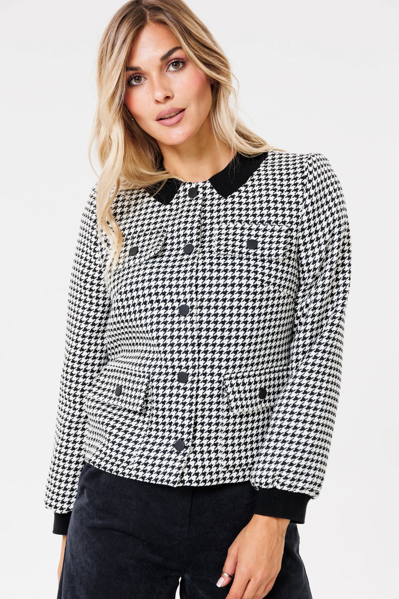 Жакет женский-бомбер на подкладке из текстильной ткани прямого силуэта. По переду расположены нагрудные вытачки, с накладными карманами и клапанами. Рукав прямой одношовный. Низ рукава со сборкой, оформлен манжетой. Вырез горловины оформлен довязом. Застежка жакета на кнопках.