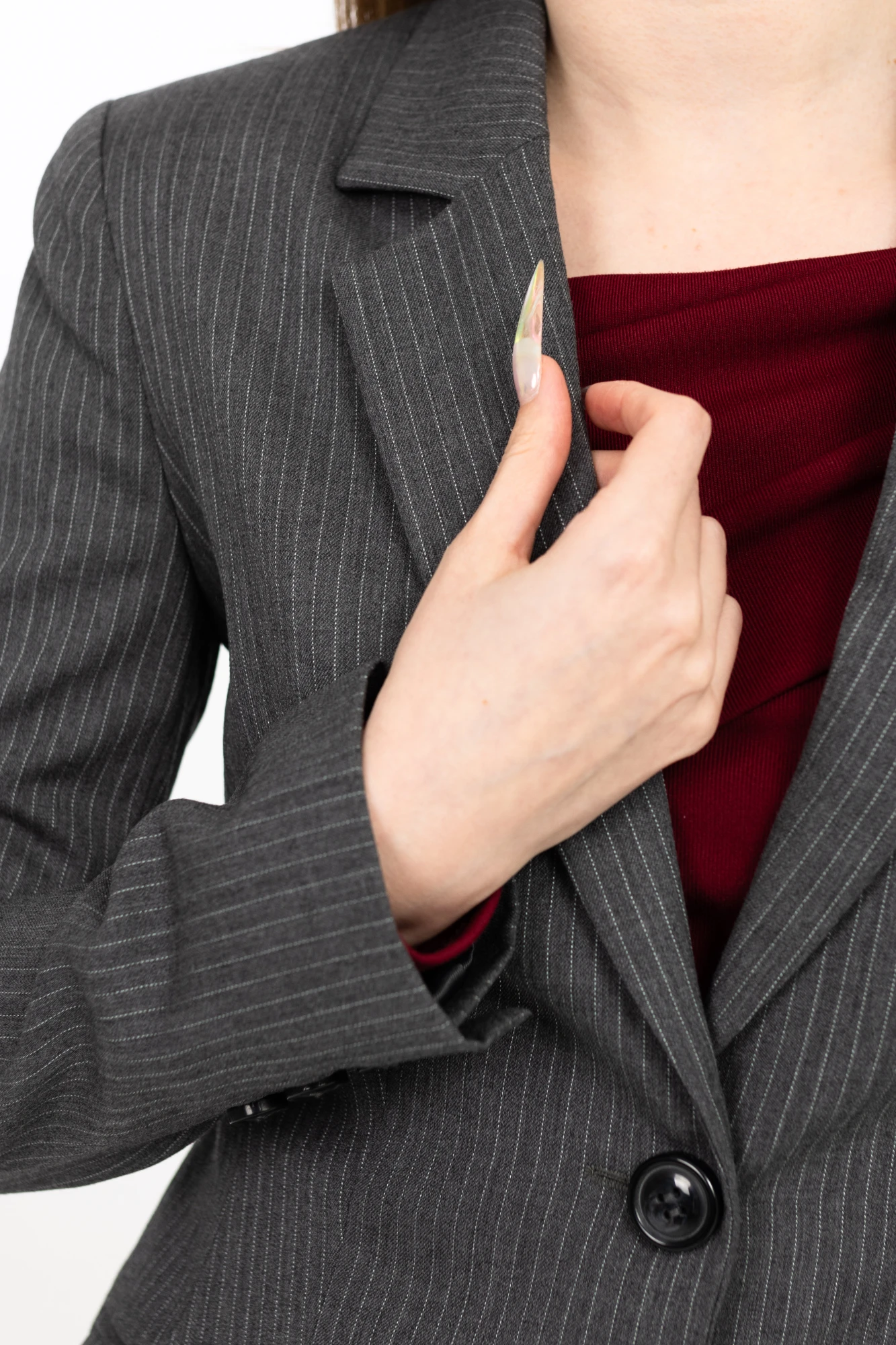 Жакет женский из 100% шерстяной ткани. Жакет полуприлегающего силуэта,центральной застежкой на 2 петли -пуговицы. Перед жакета с вертикальными рельефными швами и вытачкой. На переде жакета расположены функциональные карманы с клапаном, а на левой части переда -функциональный нагрудный карман с листочкой. Спинка со средним швом и вертикальными рельефами, которые заканчиваются шлицами. Рукава втачные, двухшовные. В локтевых швах рукавов обработаны шлицы с 3-мя декоративными пуговицами. Воротник пиджачного типа с отворотами лацканов. Жакет на подкладке.