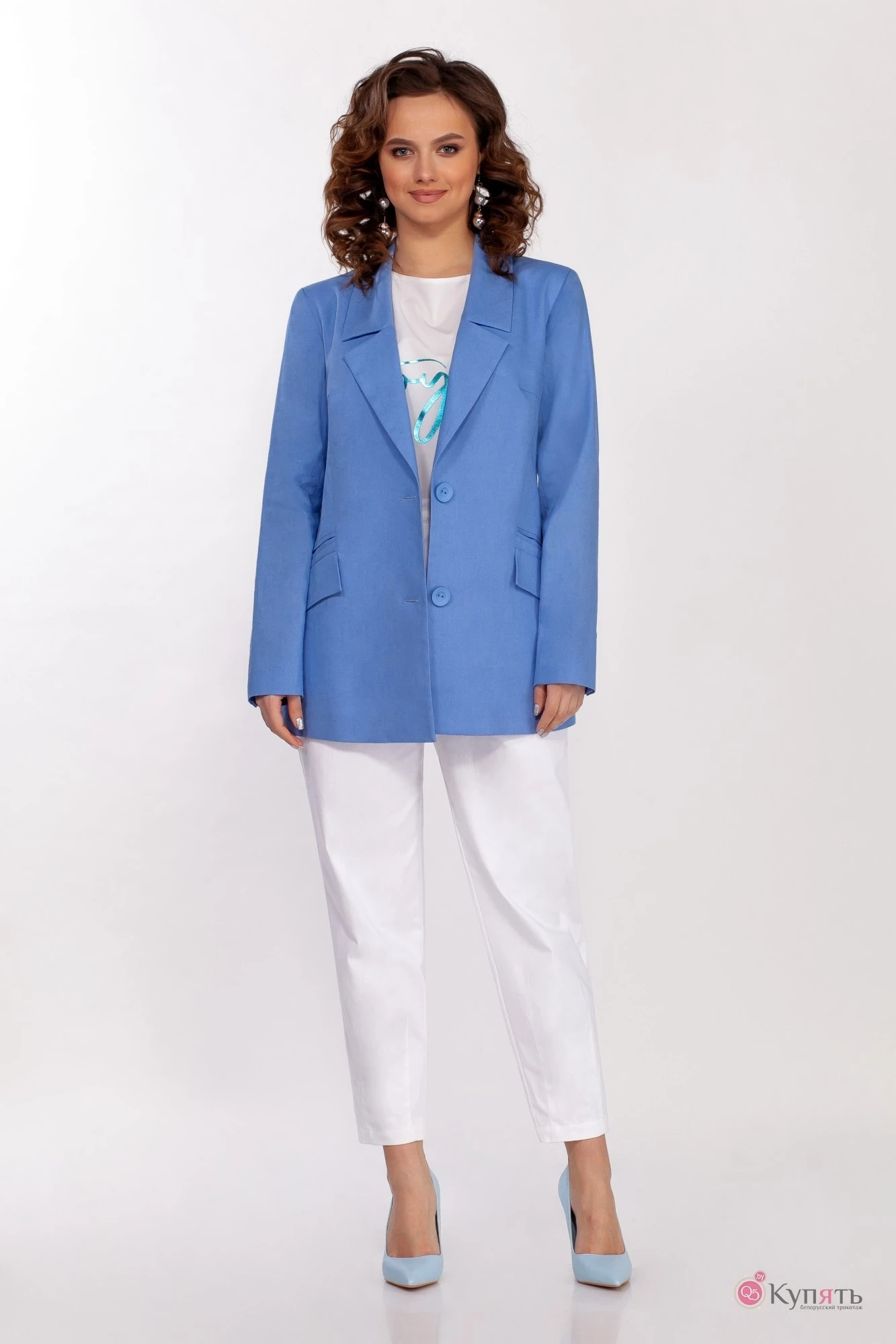 Жакет женский полуприлегающего силуэта, длиной ниже линии бедер. Спинка со средним швом. Перед с центрально-бортовой застежкой на 2 петли-пуговицы и воротником пиджачного типа. Жакет с нагрудными вытачками и наклонным рельефом от вытачек заканчивающихся на уровне кармана «в рамку» с двумя обманками. Параллельно карману ниже настрочен отделочный клапан.