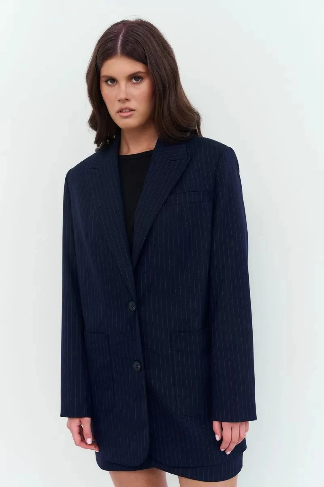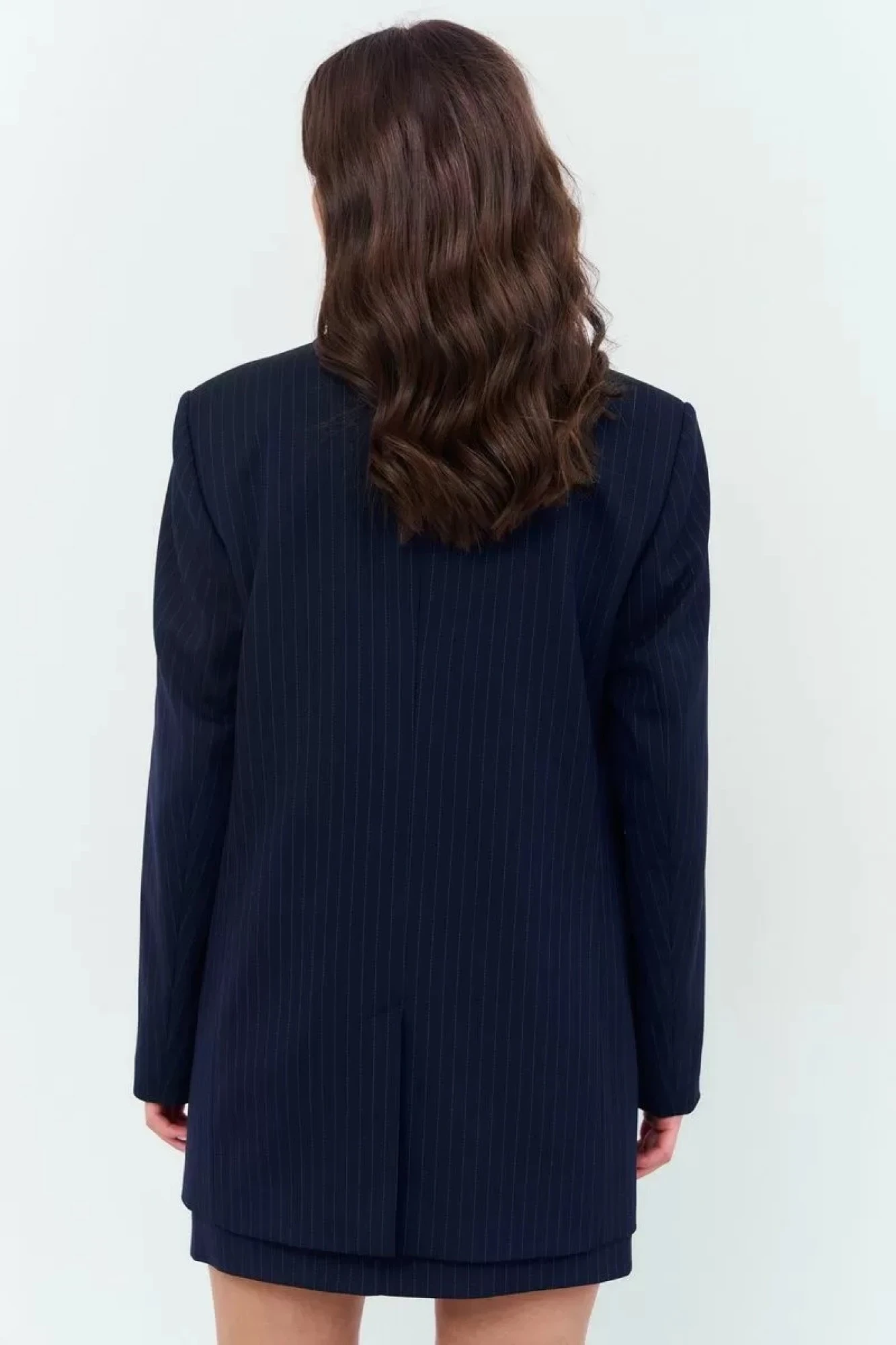 Жакет свободного кроя. Характеристики: выполнен из костюмной ткани в полоску в синем цвете, однобортная застежка на петли и пуговицы, жакет на подкладке, накладные карманы, по спинке разрез-шлица, рукава двухшовные. Длина жакета по переду 83 см, длина рукава 63,5 см.