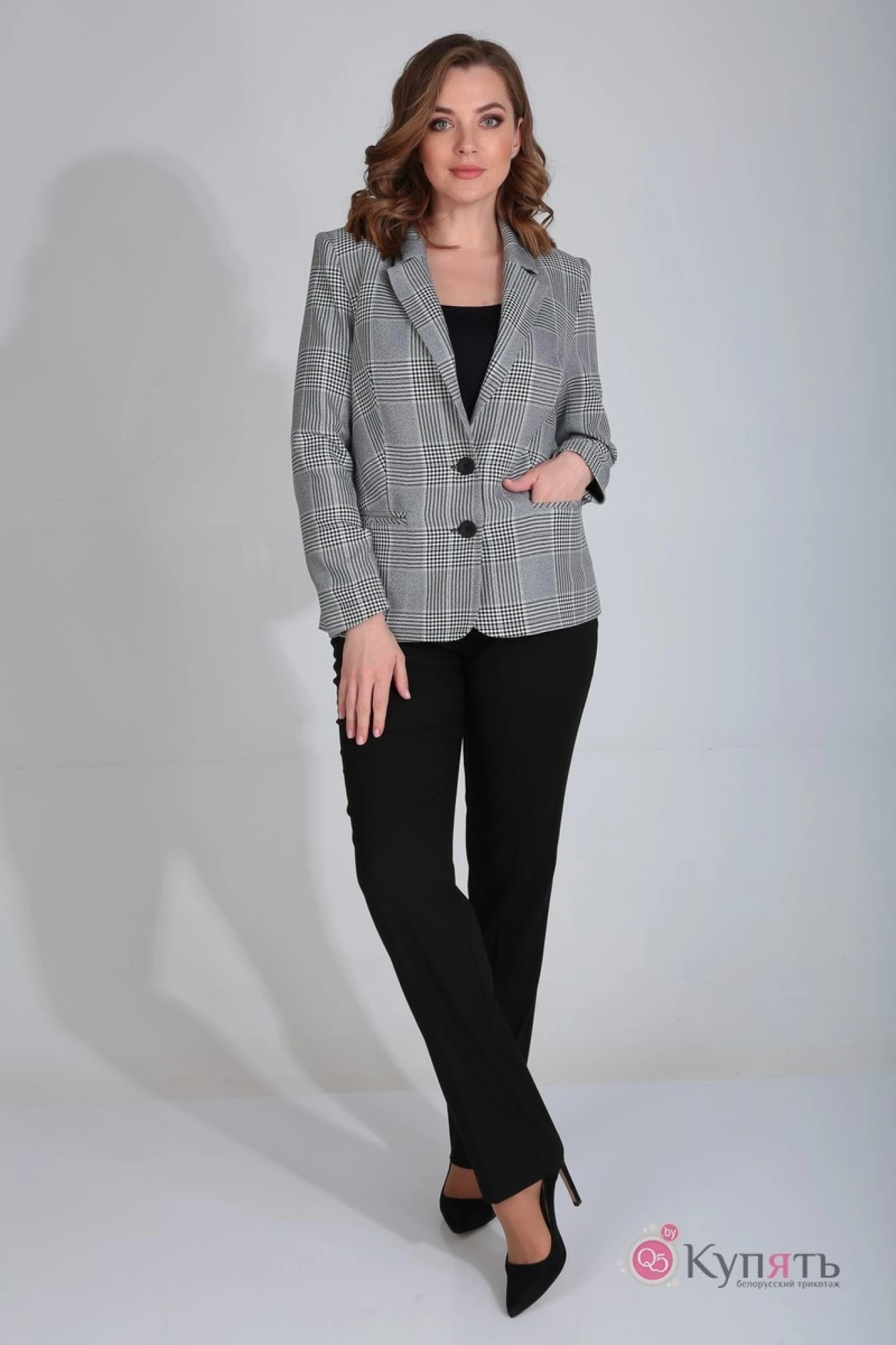 Жакет женский, полуприлегающего силуэта с лацканами, отложным стоячим воротником и центральной застежкой на 2 петли и пуговицы.
