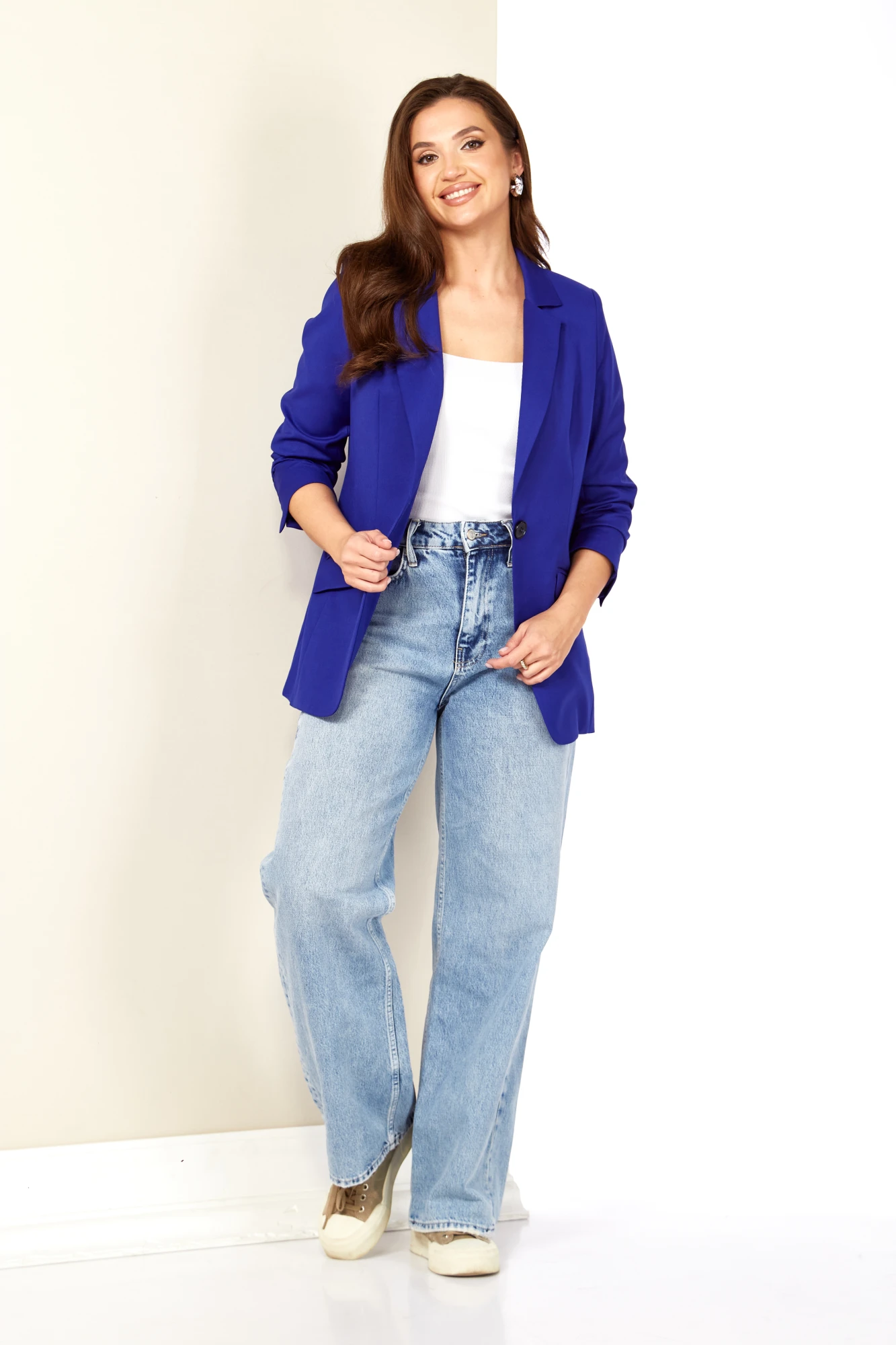 Эффектный жакет из текстильной ткани станет отличным дополнением вашего гардероба. Жакет женский удлиненный, полуприлегающего силуэта с центральной бортовой застежкой на пуговицу, на подкладке. Перед жакета с боковыми рельефными швами от проймы до низа изделия. Воротник отложной пиджачного типа. Перед с прорезными карманами и клапаном. Рукав длинный, втачной, двух шовный. По низу рукава шлица и потайная застежка-обманка на 3 пуговицы. Спинка с боковыми рельефными швами от линии проймы до линии низа и со средним швом.