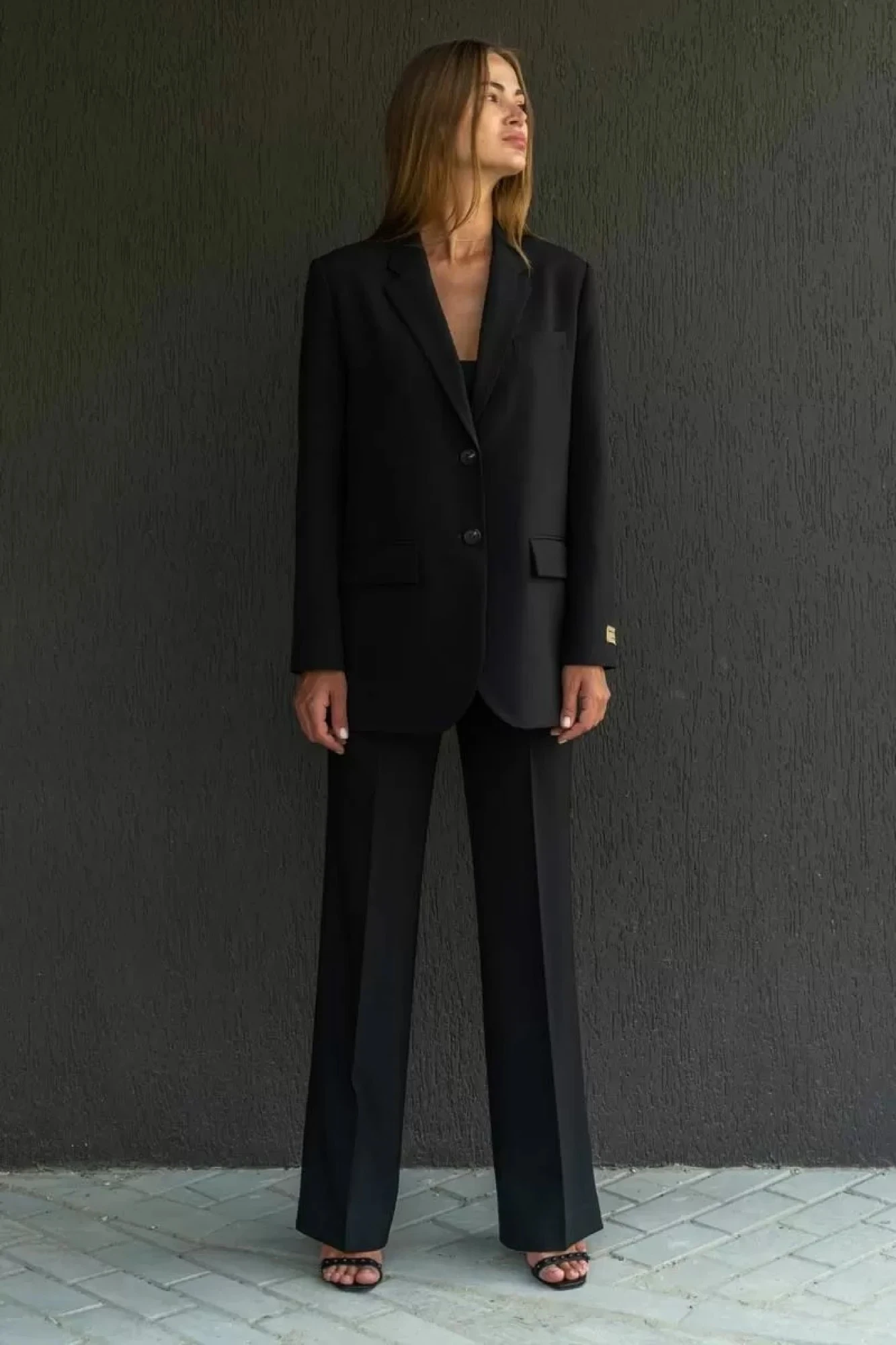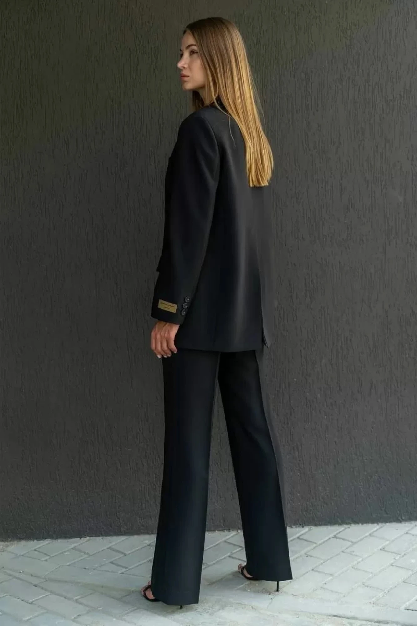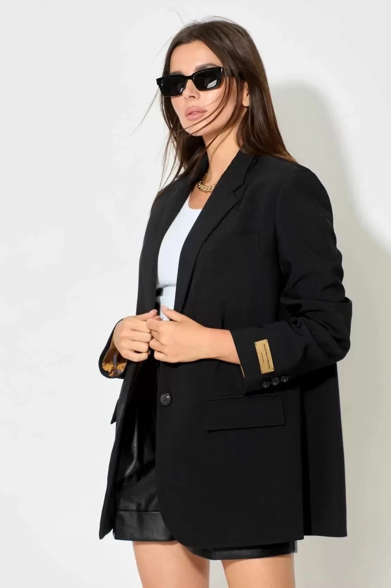 Универсальный (базовый) трендовый жакет свободного силуэта, с цельнокроеными бочками, на подкладке. Воротник пиджачного типа с отложным лацканом, на левой полочке листочка. Спереди прорезные карманы в рамку с клапаном. Спинка со средним швом и высокой отлетной шлицей (40 см.). Рукав втачной , двухшовный, со шлицей и пуговицами. На левом рукаве настрочена декоративная бирка.