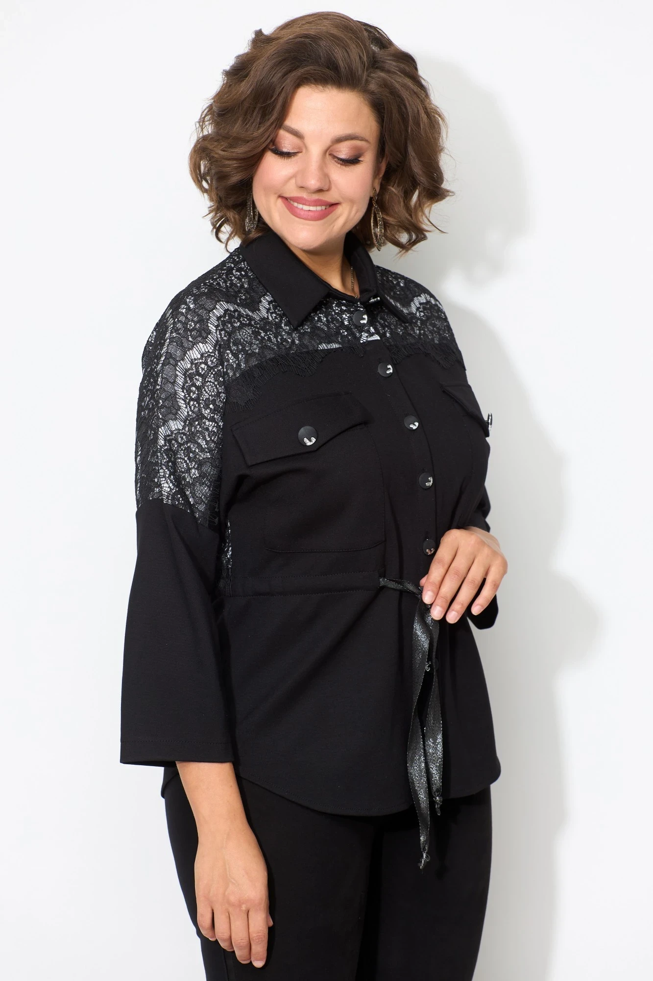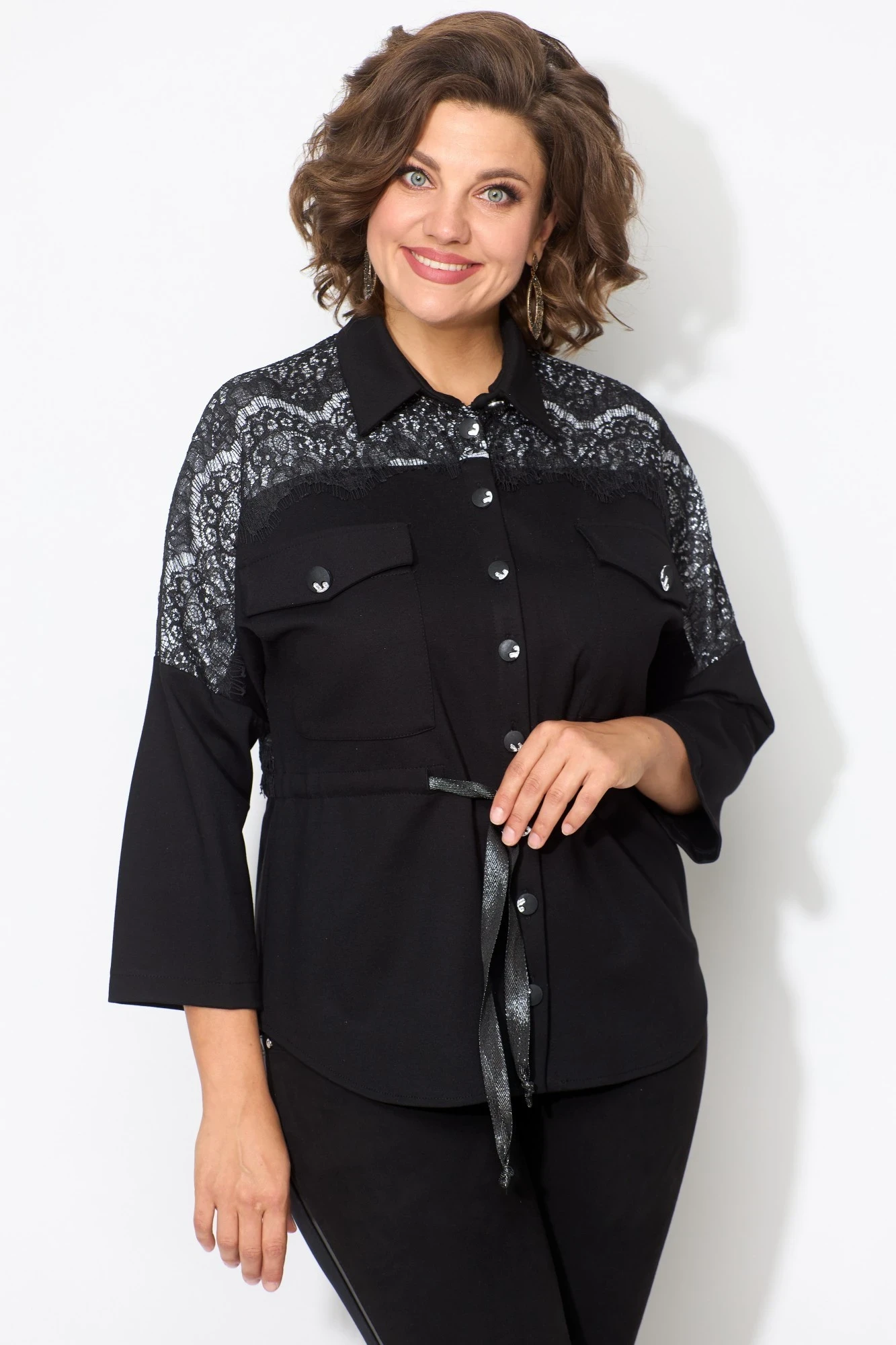 Жакет свободного кроя, силуэт-летучая мышь. Застежка-планка с петлями-пуговицами. Воротник рубашечного типа. По переду в области груди накладные карманы с клапаном. В области талии по спинке и переду вставлена кулиса, в которую втягивается декоративная тесьма, что позволяет регулировать объем по линии талии.