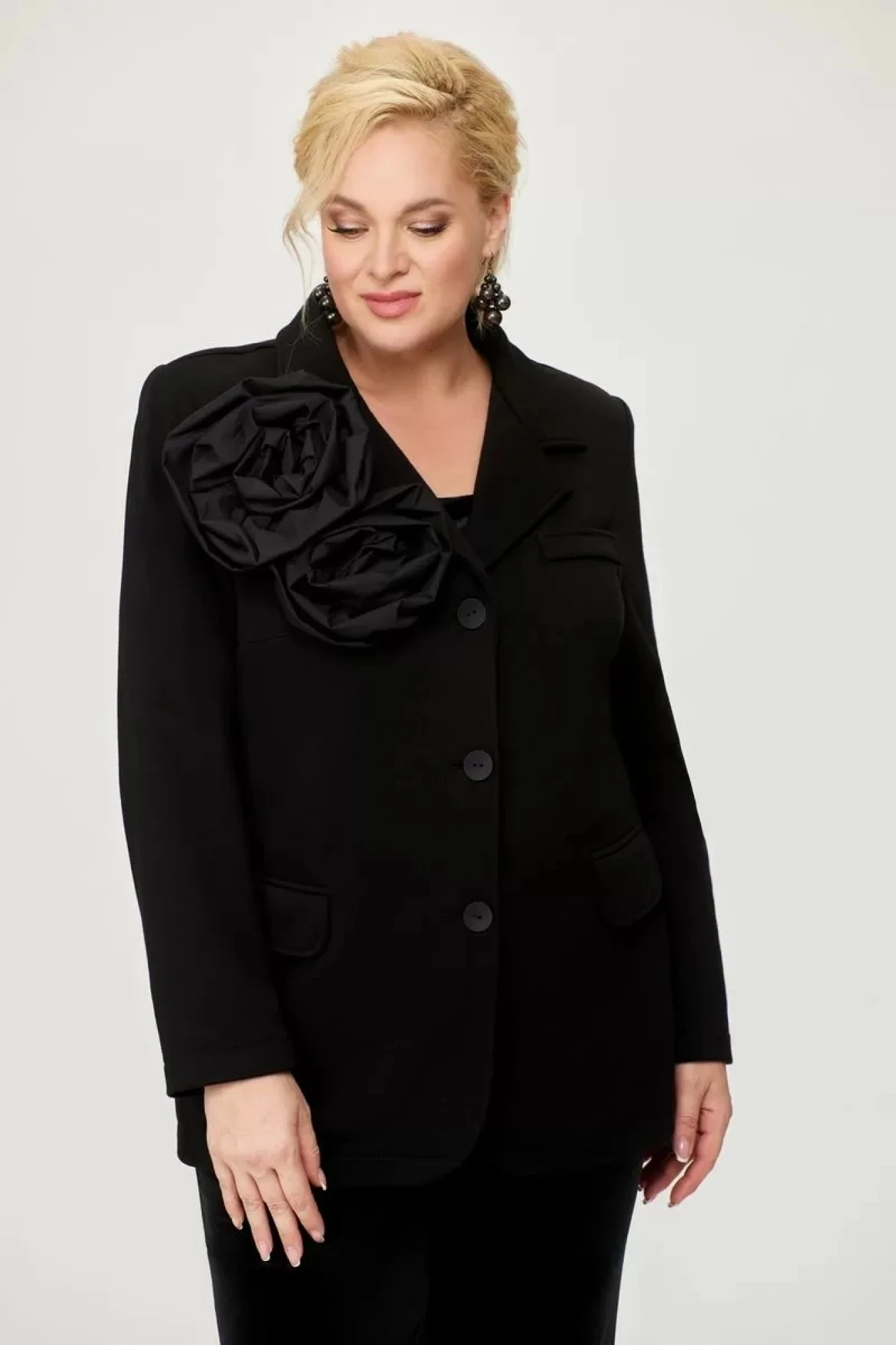 Жакет женский однобортный из футера, прямого силуэта. Воротник отложной пиджачного типа, лацканы прямоугольной формы. По переду прорезные карманы с клапаном. Спинка со средним швом. Рукав втачной длинный. Застежка на три петли и пуговицы. Изделие без подкладки. Украшением служат съемные объемные цветы из отделочной ткани.