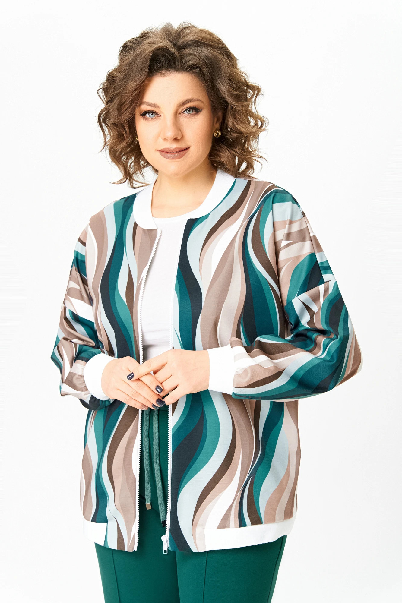 Бомбер женский из вискозного трикотажного полотна свободного кроя со спущенной линией плеча и с центральной застёжкой на молнию. В боковых швах обработаны карманы. Горловина округлая со стойкой из трикотажного довяза. Рукав длинный. По низу рукава и изделия - довяз.