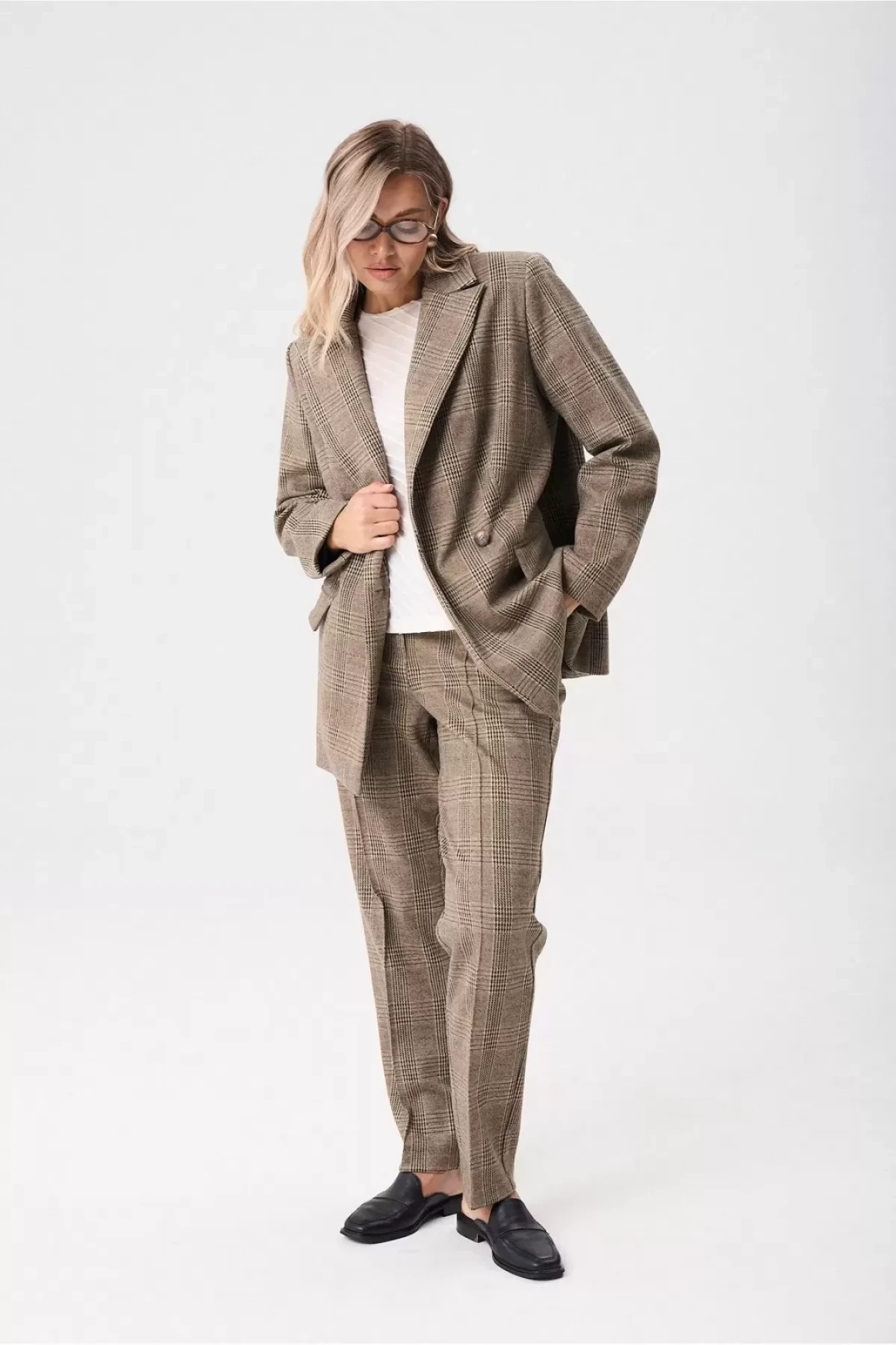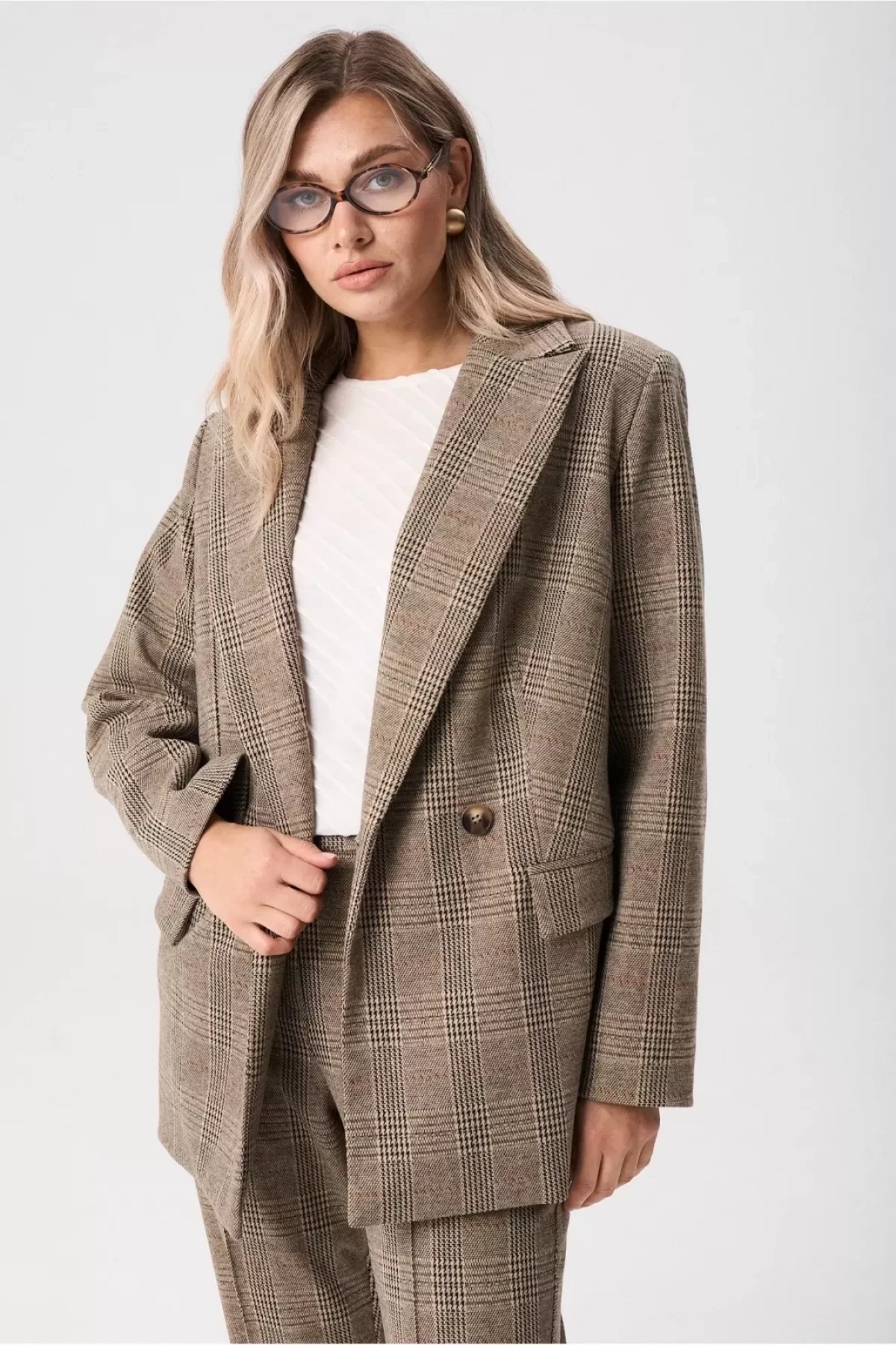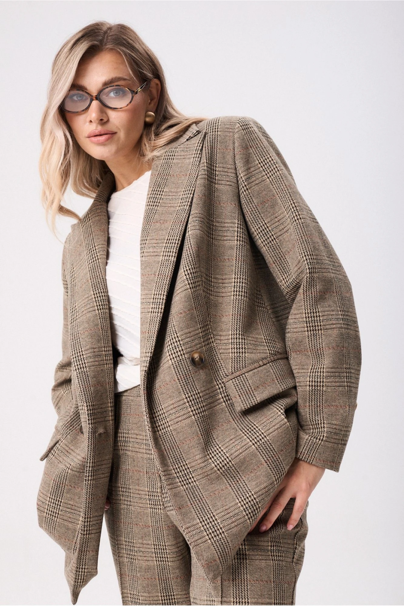 Жакет прямого силуэта. Воротник пиджачного типа.Застежка двубортная на петли пуговицы. По переду прорезной карман с клапаном. Втачной рукав, длинный. По рукаву декоративная шлица с пуговицами. Жакет на подкладке с плечевыми накладками.