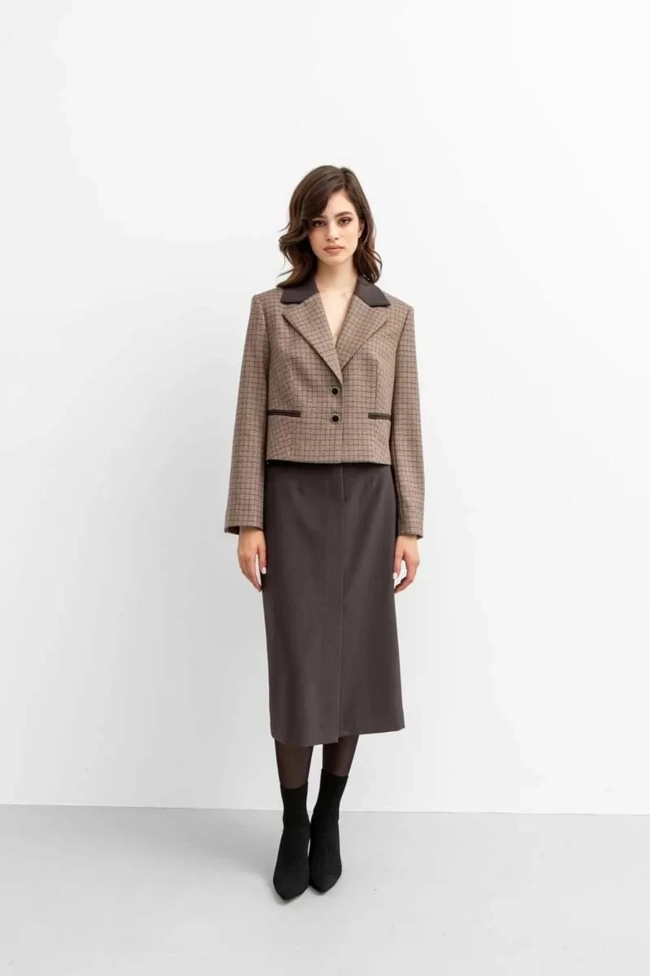 Жакет женский, прямого силуэта укороченный. Из высококачественной поливискозы. Воротник отложной с лацканами. Рукав втачной длинный, двух шовный. По низу рукава расположена шлица и пришиты отделочные пуговицы. Перед с талевыми вытачками, состоит из 2х половинок. На которых расположены карманы «в рамку». Изделие на подкладке.