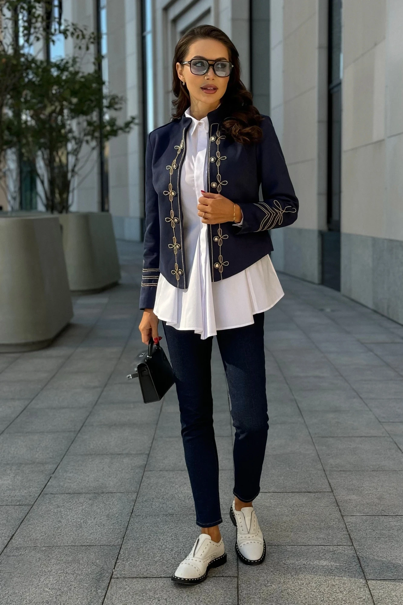 50:Длина жакета по среднему шву спинки – 49,5 см (±1,5 см), Ширина на уровне глубины проймы – 55,0 см (±1,0 см), Ширина на уровне линии талии – 51,0 см (±1,0 см), Длина рукава – 61,0 см (±1,0 см), Ширина рукава жакета вверху – 19,0 см (±1,0 см), Ширина рукава внизу - 13,5 см (±0,5 см), Длина плеча – 12,5 см (±0,5 см).
