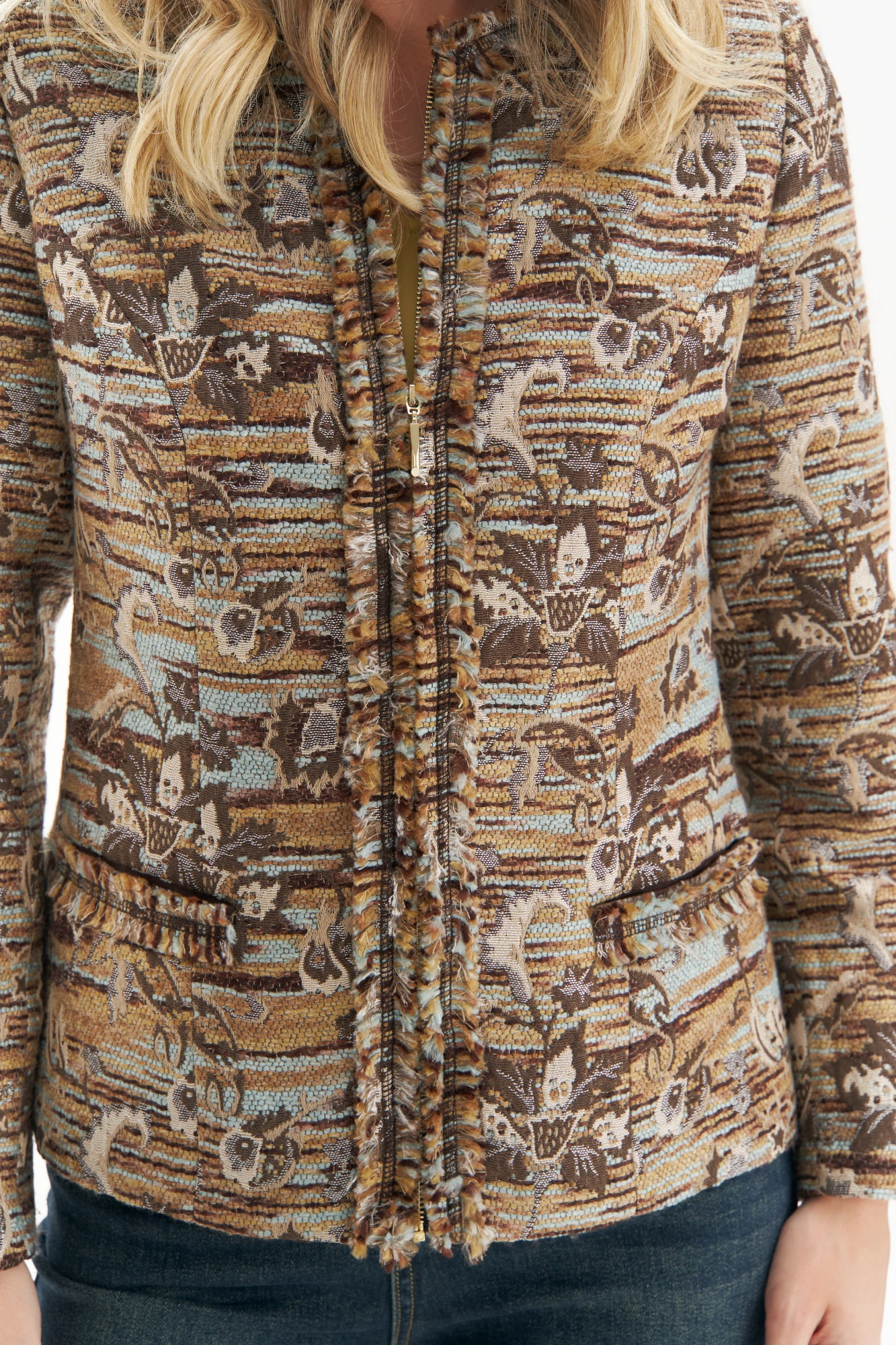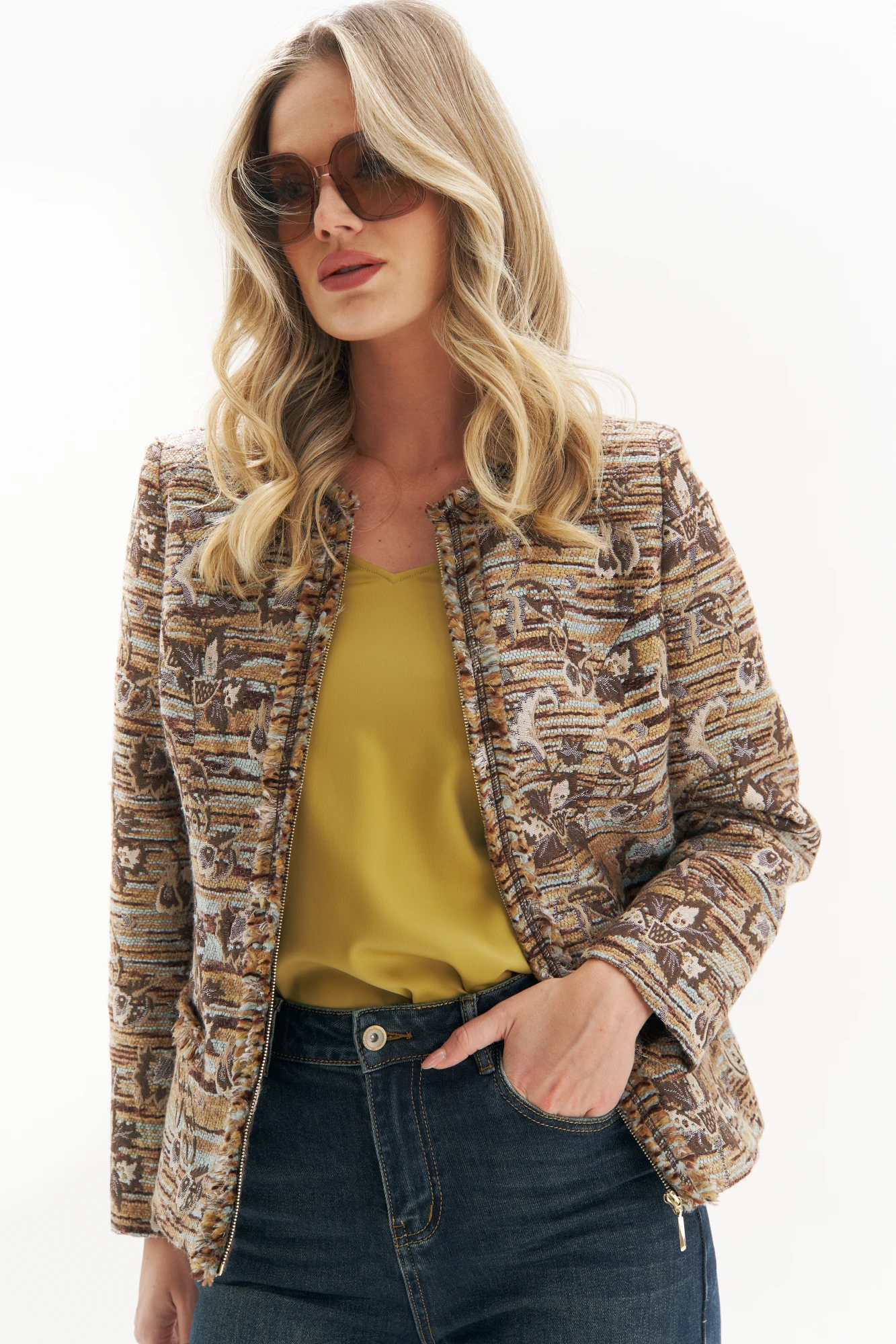 Этот твидовый жакет — воплощение элегантного шика с современными нотками. Его фактурная ткань с утонченным жаккардовым узором создает ощущение роскоши и тепла, а аккуратный крой подчеркивает женственный силуэт. Декоративная бахрома по краям придает образу легкую нотку богемности, делая его актуальным для повседневных и вечерних выходов. Этот жакет легко комбинируется как с классическими брюками, так и с расслабленными джинсами, позволяя создавать стильные и эффектные луки в духе французского effortless chic.